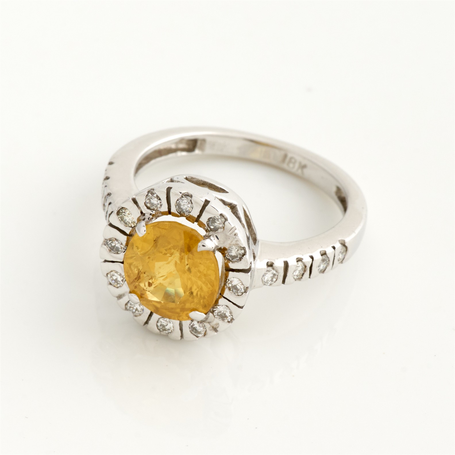 A YELLOW SAPPHIRE RING IN 18CT WHITE GOLD, THE SAPPHIRE WEIGHING 2.55CTS, SIZE M, 4.4GMS