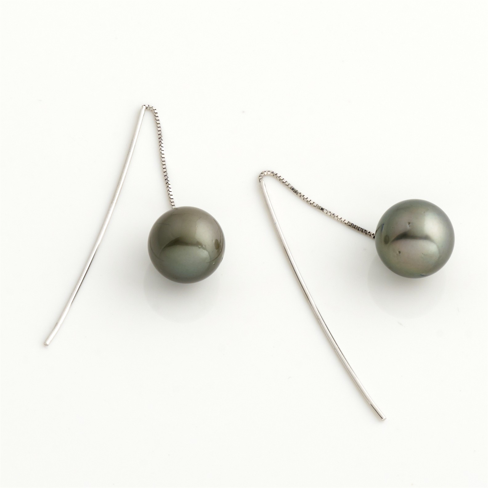 A PAIR OF TAHITIAN PEARL EARRINGS IN 18CT WHITE GOLD, THE PEARLS MEASURING APPROXIMATELY 13.5MM, DROP LENGTH 40MM, 8.2GMS