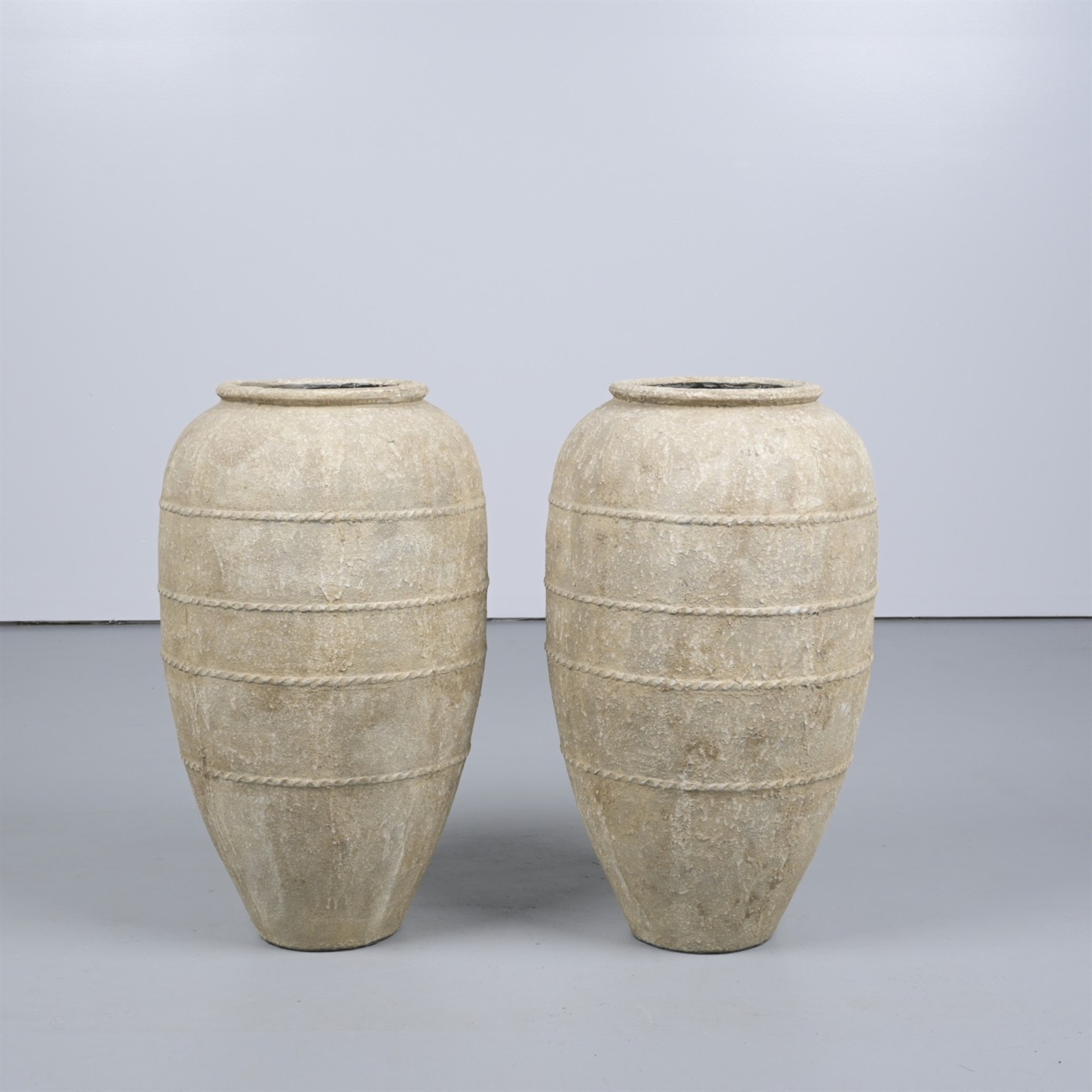 A PAIR OF COMPOSITE URNS (82CM H X 42CM W) (THIS ITEM MUST BE REMOVED BY PROFESSIONAL CARRIERS OR CLIENTS. LEONARD JOEL STAFF CANNOT ASSIST WITH CARRYING OR DELIVERY OF THIS ITEM)