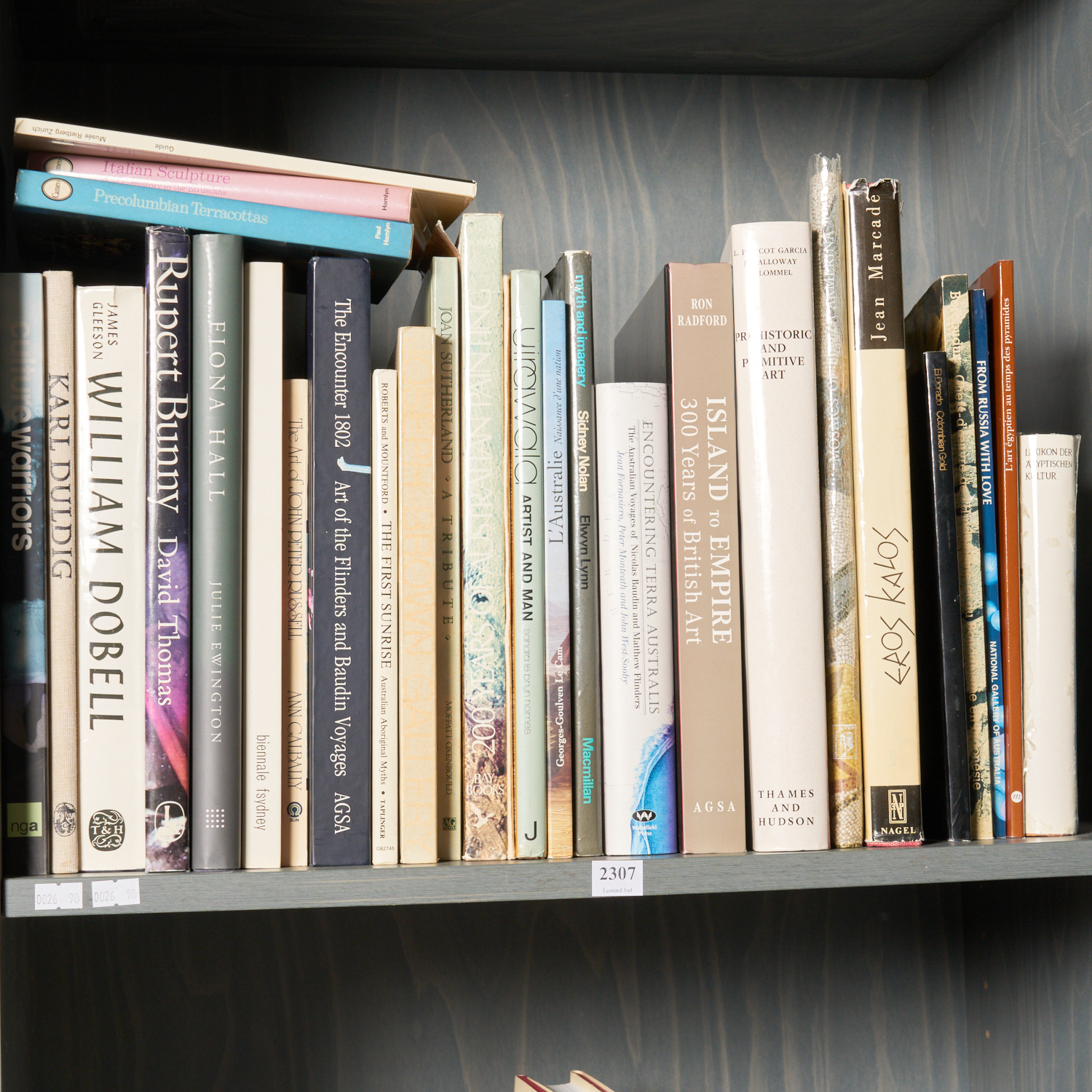 A SHELF OF ART REFERENCE BOOKS INCLUDING BOOKS ON AUSTRALIAN ART AND PREHISTORIC ART