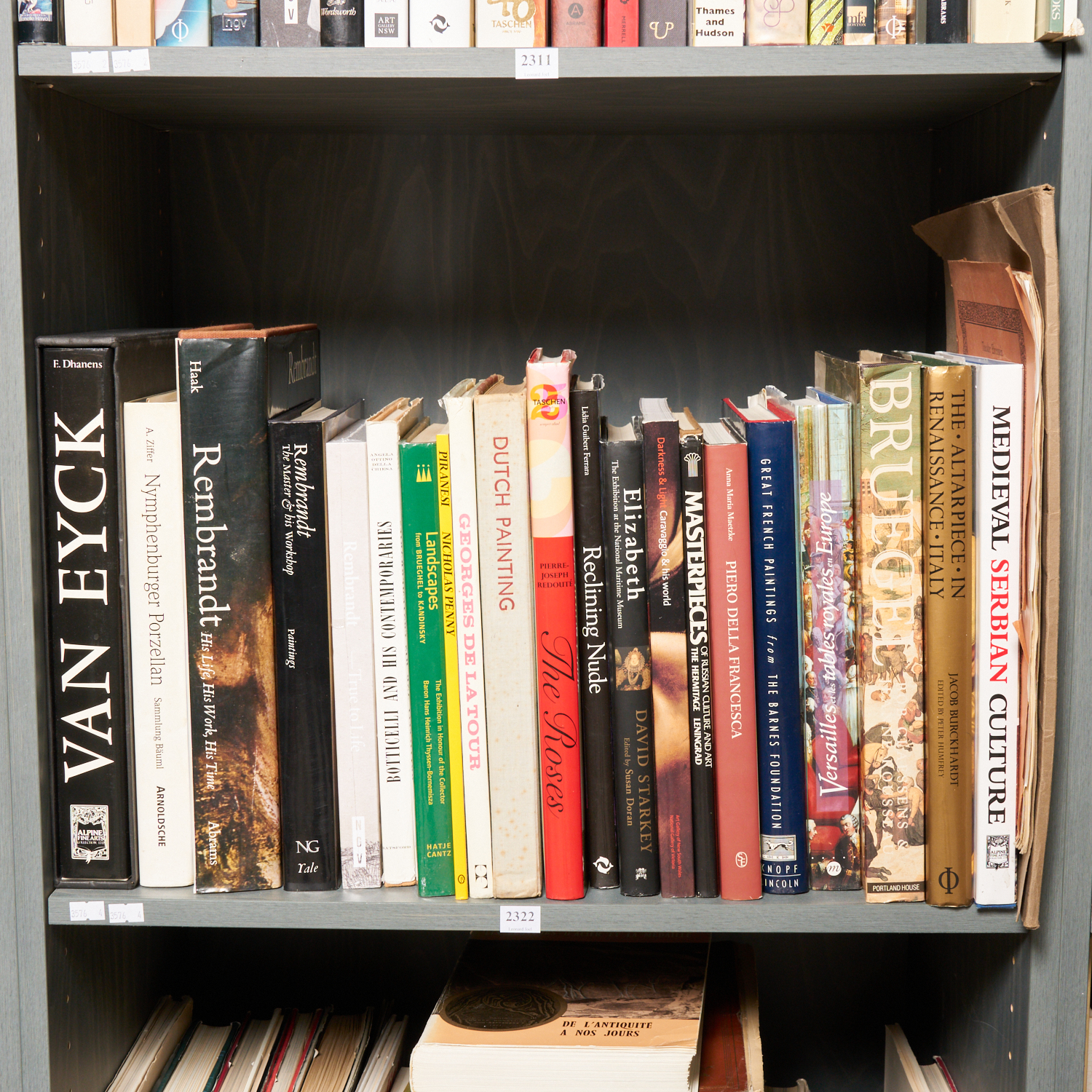 A SHELF OF PRE 19TH CENTURY ART INCLUDING REMBRANDT, REDOUTE 'THE ROSES', BRUEGEL, AND MEDIEVAL SERBAN CULTURE