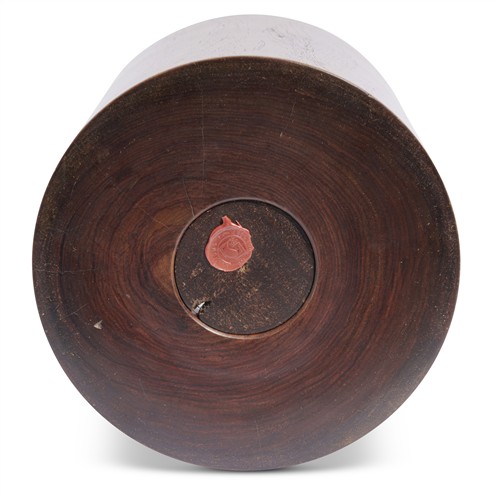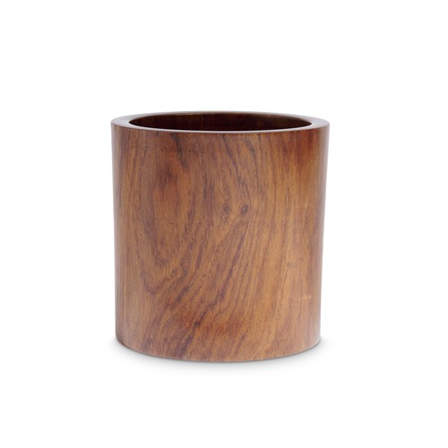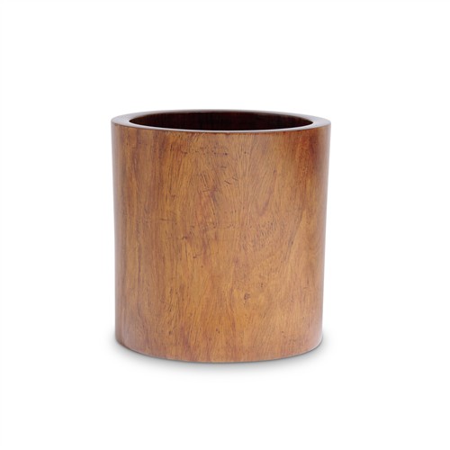 Of cylindrical form with subtly tapering sides, the vessel is fashioned from a single section of richly figured huanghuali, the wood displaying a warm golden-brown tone with an attractive, natural grain. The surface has developed a soft, lustrous patina from age and handling. The base is neatly fitted with a circular plug. Such brushpots, prized for their elegant simplicity and the inherent beauty of the timber, were essential accoutrements on the scholar's desk and remain highly sought after today.