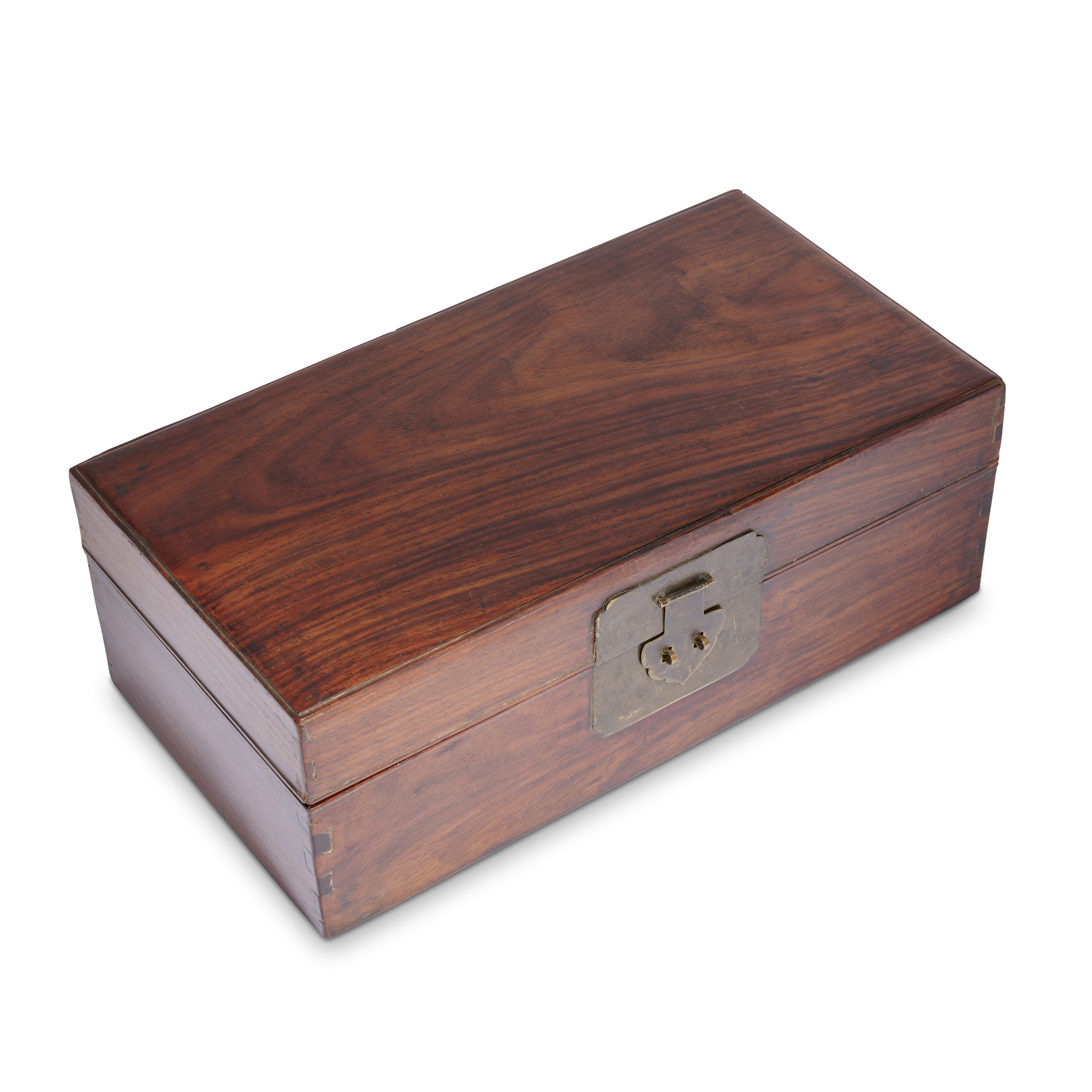 The cover of the box inlaid to the top with ruyi-shaped mounts, and the front further set with a cloud-form hasp on a square back plate. The finely grained wood displays a rich patina and a deep, lustrous sheen.