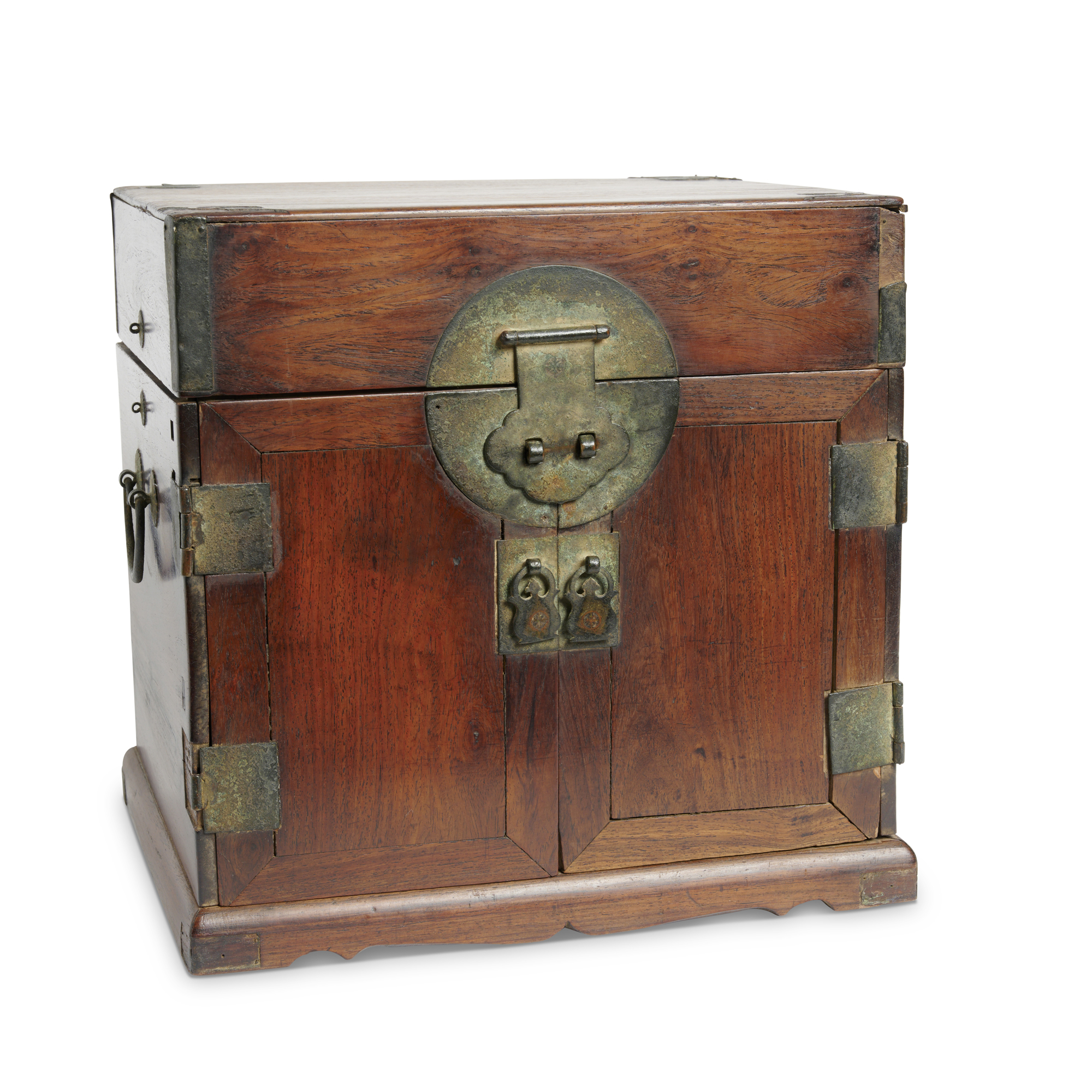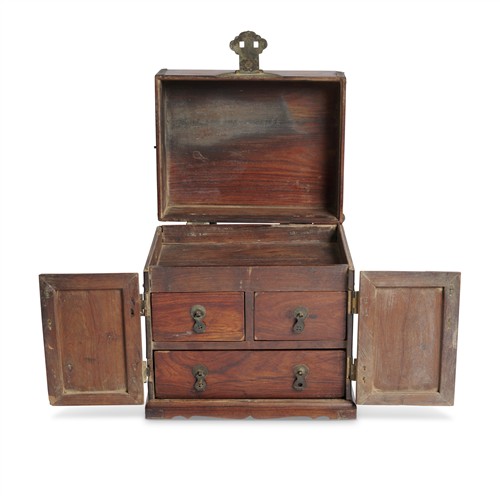 The rectangular flat hinged top opening to a shallow tray and the two front panel doors fitted flush and opening to reveal the interior with three drawers, with attractive ruyi head and floriform fittings, a cloud-shaped hasp, lockplate