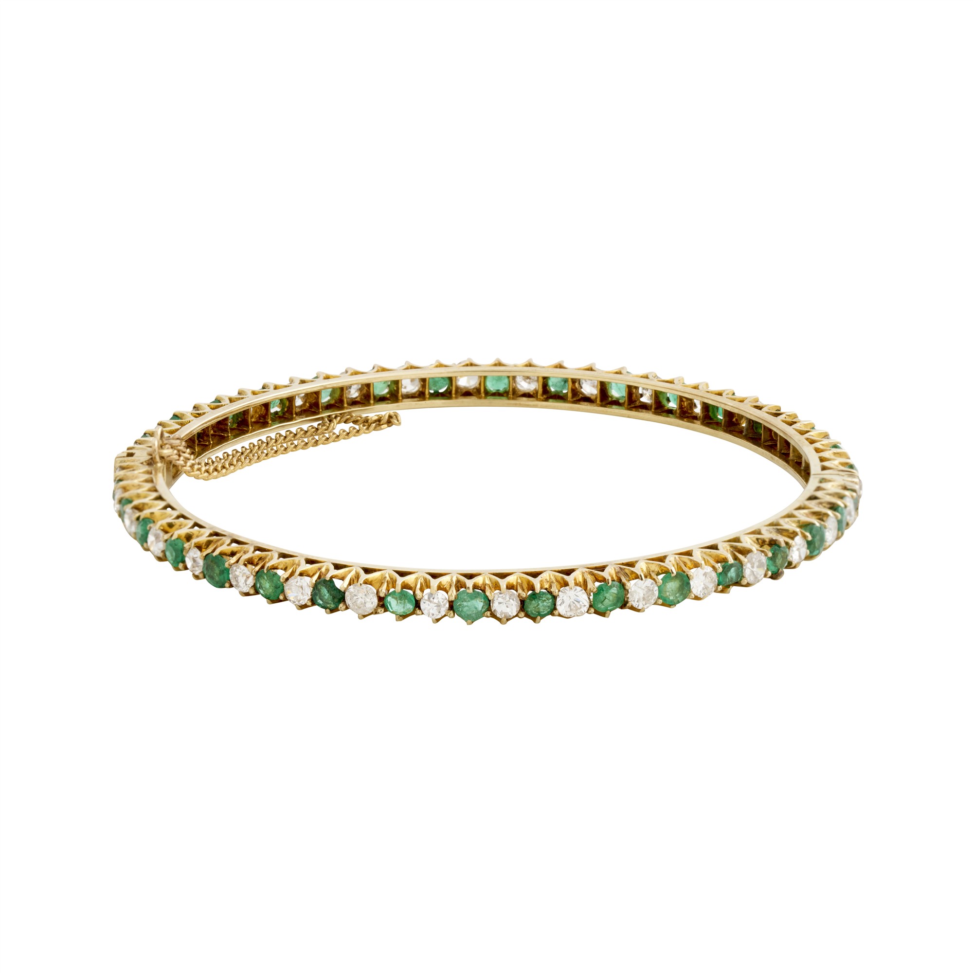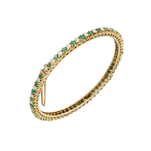 A round hinge bangle of alternating claw-set oval cut emeralds and old-cut round diamonds to a box clasp with safety chain, the diamonds together weighing approximately 1.02 carats, internal diameter approximately 155mm, gross weight approximately 13.4 grams.
