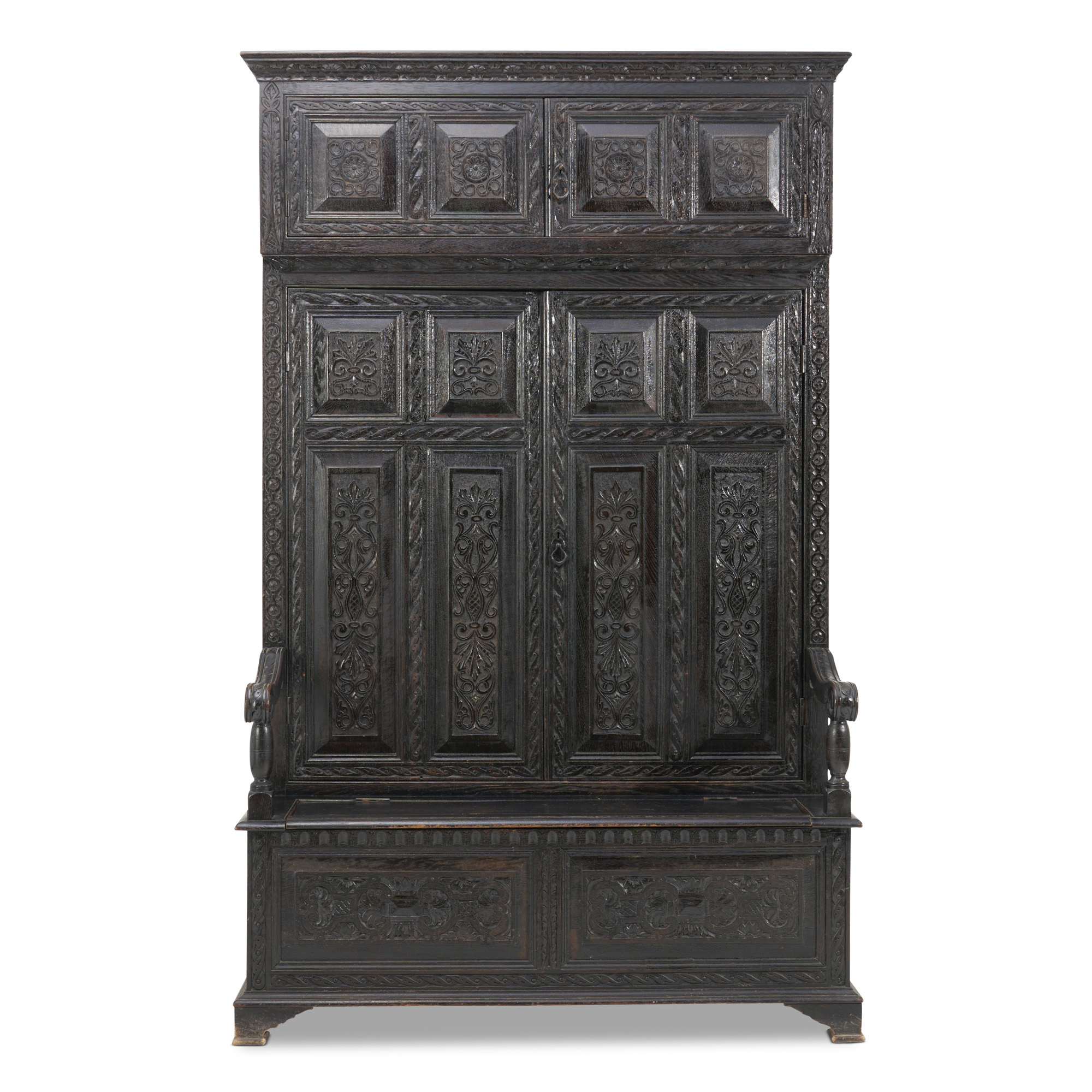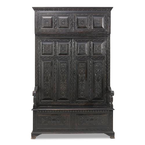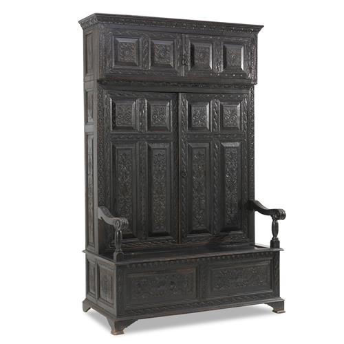 Of early Georgian design, the high back enclosing an upper cupboard above a hanging compartment, each within a pair of doors, the box seat with hinged top and open scrolling arms, the front and sides with fielded panels and carved throughout in seventeenth century manner