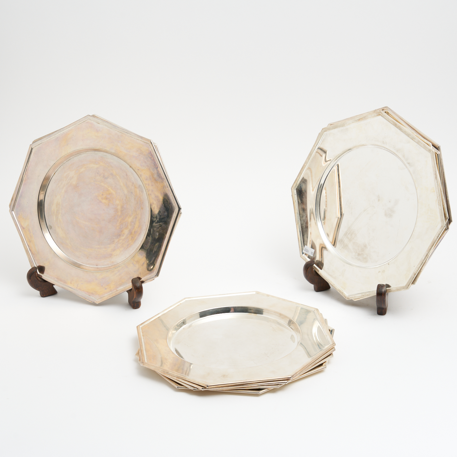 A SET OF TWELVE OCTAGONAL SILVER PLATE UNDER PLATES DIA.29CM