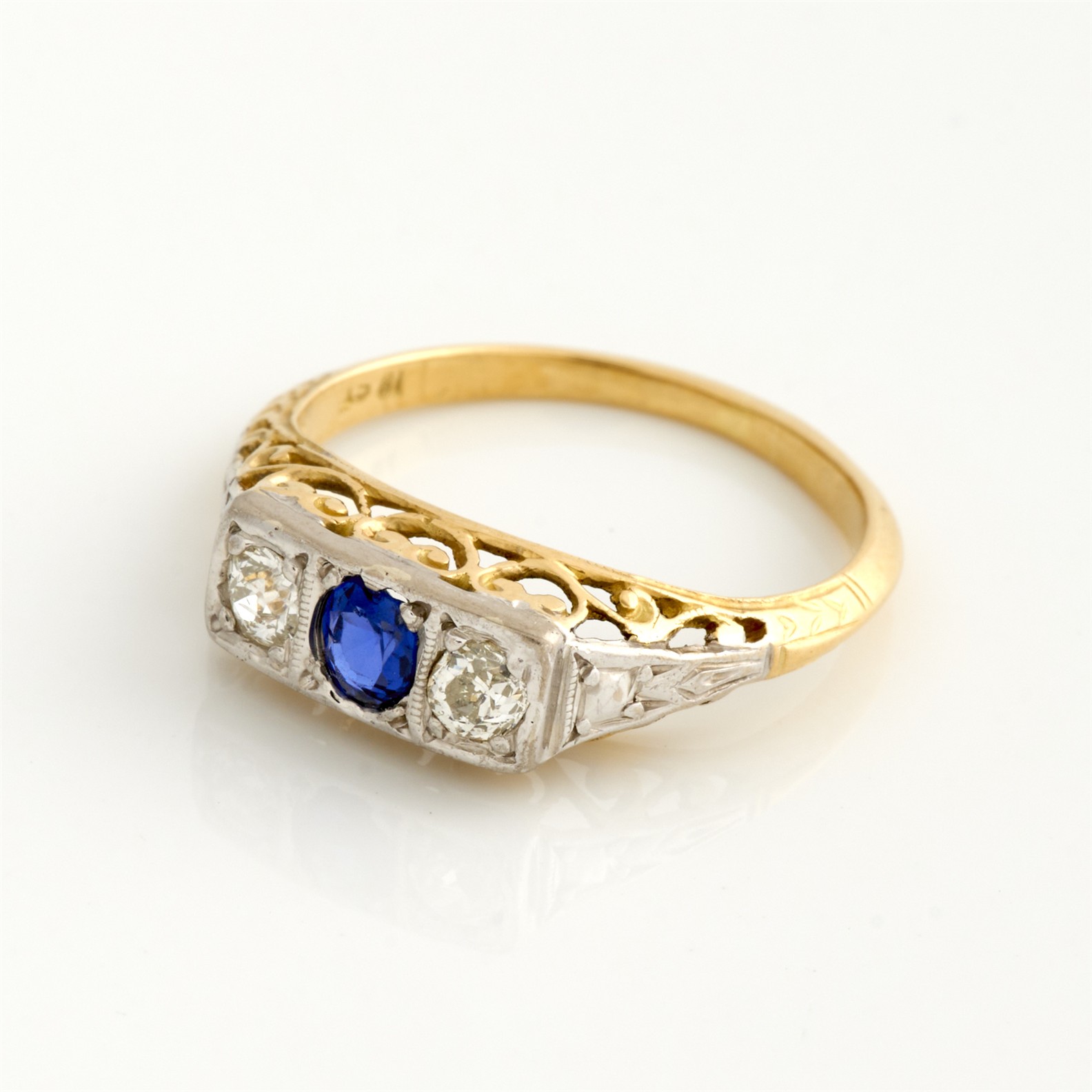 AN ART DECO SAPPHIRE AND OLD CUT DIAMOND RING IN 18CT GOLD, THE SAPPHIRE WEIGHING APPROXIMATELY 0.25CT, THE DIAMONDS WEIGHING APPROXIMATELY 0.32CT, FINGER SIZE M1/2, 2.89GMS