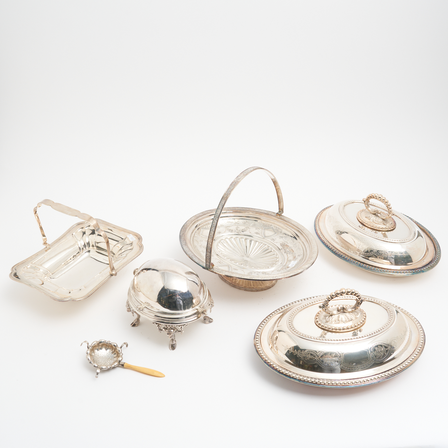A COLLECTION OF SILVER PLATE INCLUDING TWO TUREENS, A ROLL-TOP BUTTER TUREEN, A STRAINER, AND TWO SWING HANDLE BASKETS L.30.5CM (LONGEST)