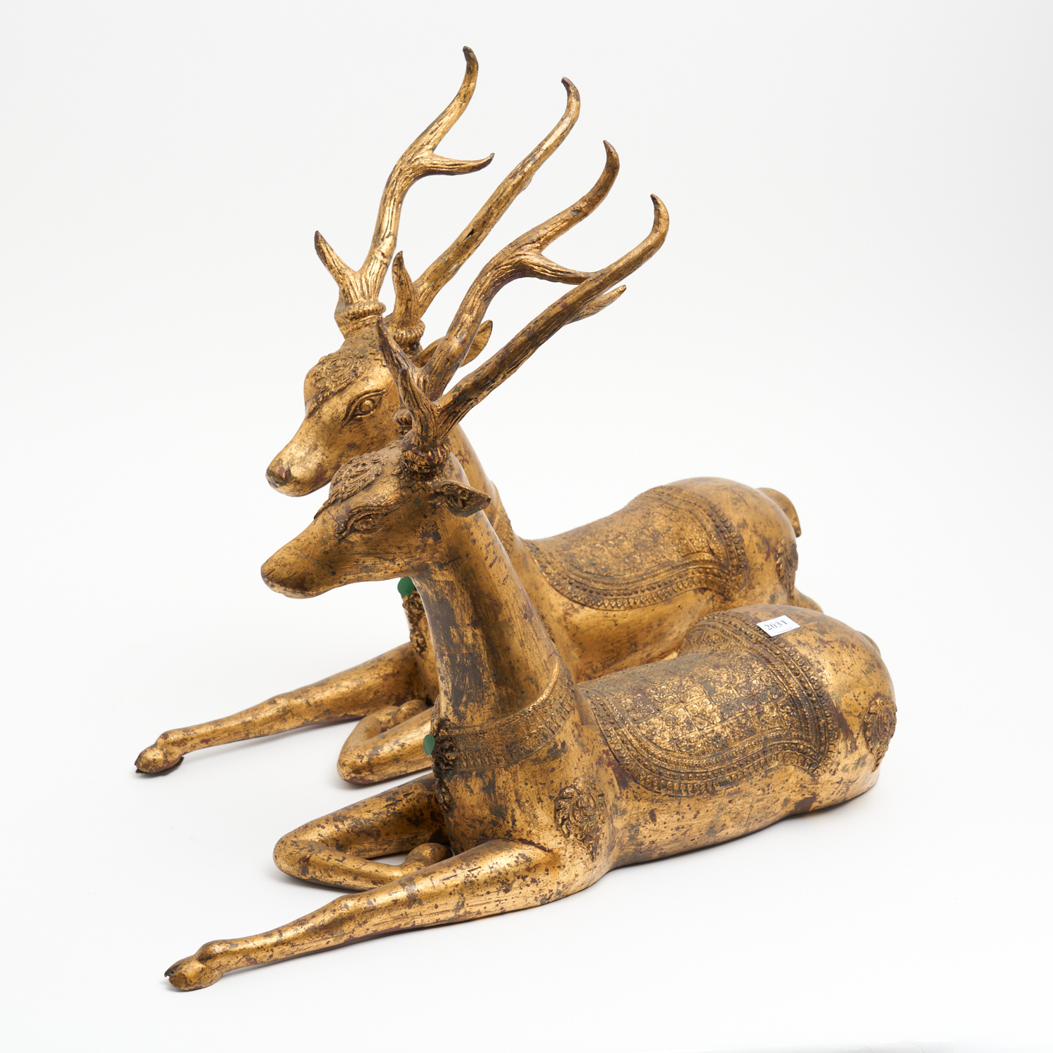 A PAIR OF ASIAN GILT METAL FIGURES OF RECUMBENT DEER L.56CM