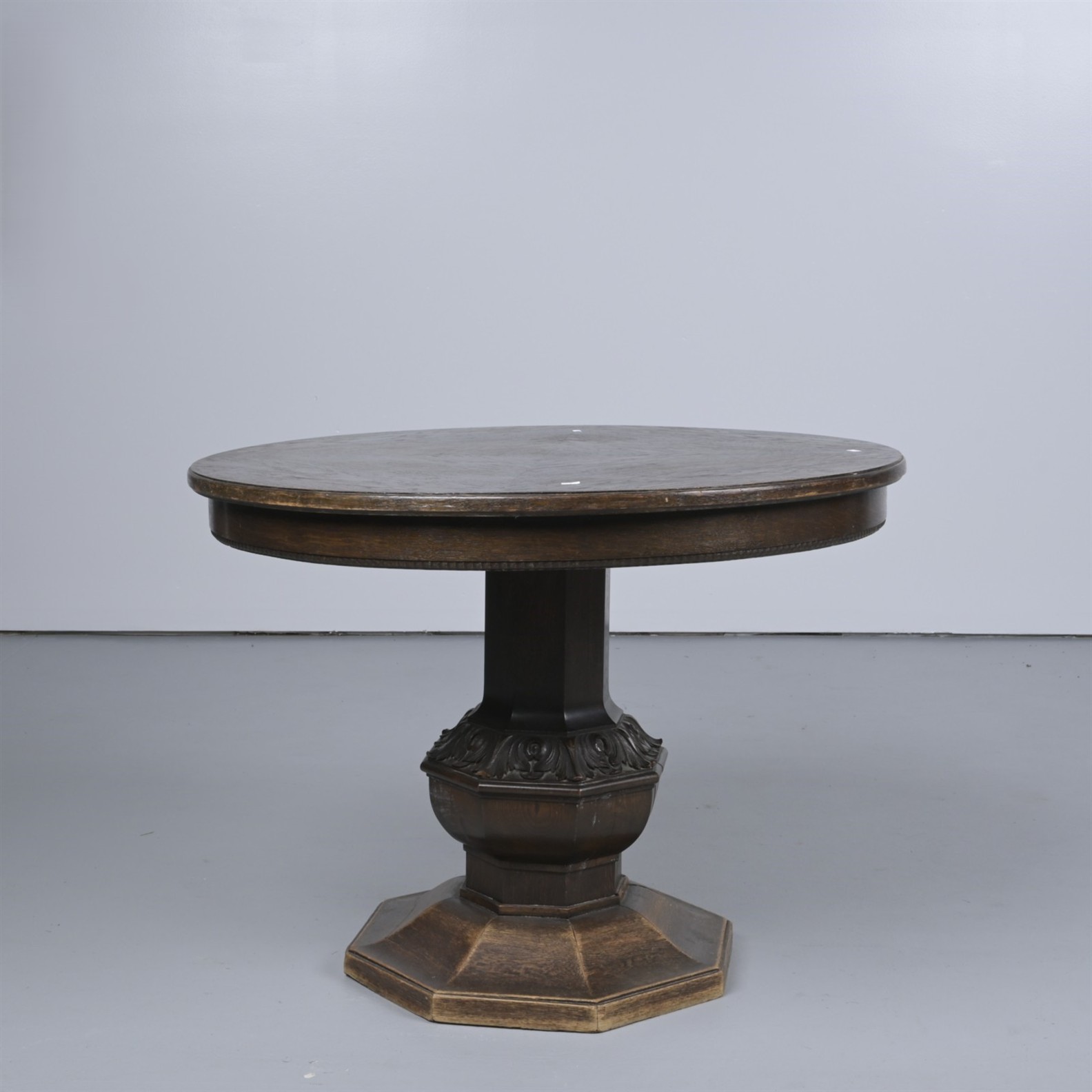 AN EARLY 20th CENTURY OAK CIRCULAR CENTRE TABLE ( 73H X 96DIA CM)(THIS ITEM MUST BE REMOVED BY PROFESSIONAL CARRIERS OR CLIENTS. LEONARD JOEL STAFF CANNOT ASSIST WITH CARRYING OR DELIVERY OF THIS ITEM)