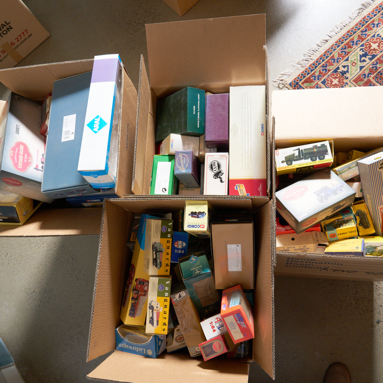 FOUR LARGE BOXES CONTAINING A RANGE OF MODEL CAR BOXES