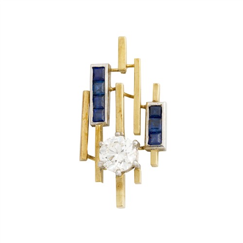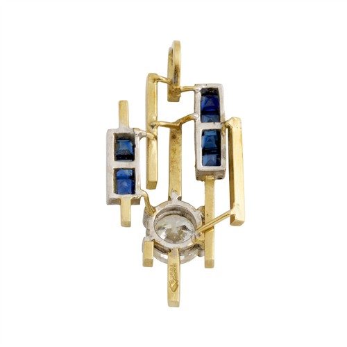 Centring a claw-set round brilliant-cut diamond weighing approximately 1.00 carat, to a geometric openwork design of layered bars with bezel set sapphires to a hidden bale, length approximately 33mm, gross weight approximately 4.8 grams.