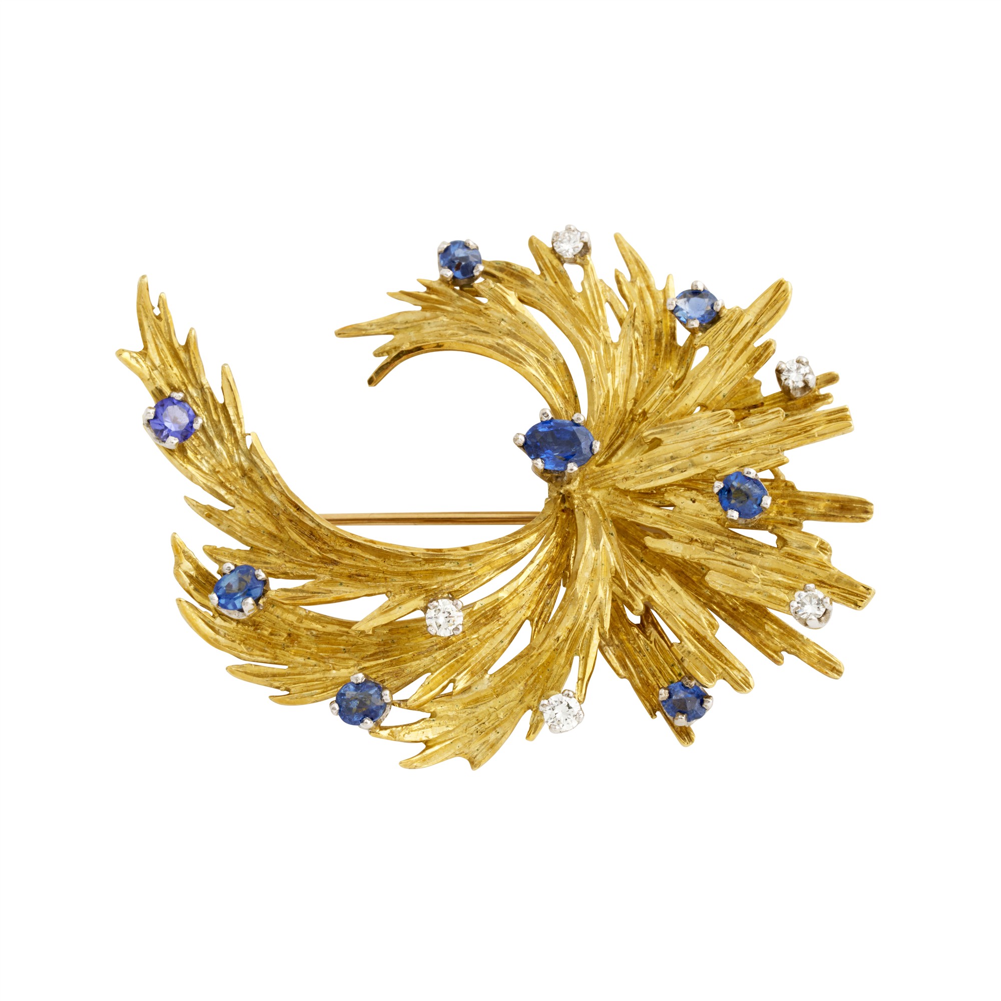 Centring an oval sapphire with radiating satin sprays set with five claw-set round brilliant-cut diamonds, sapphires and one tanzanite, the diamonds together weighing approximately 0.30 carats, width approximately 65mm, gross weight approximately 20.4 grams.