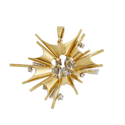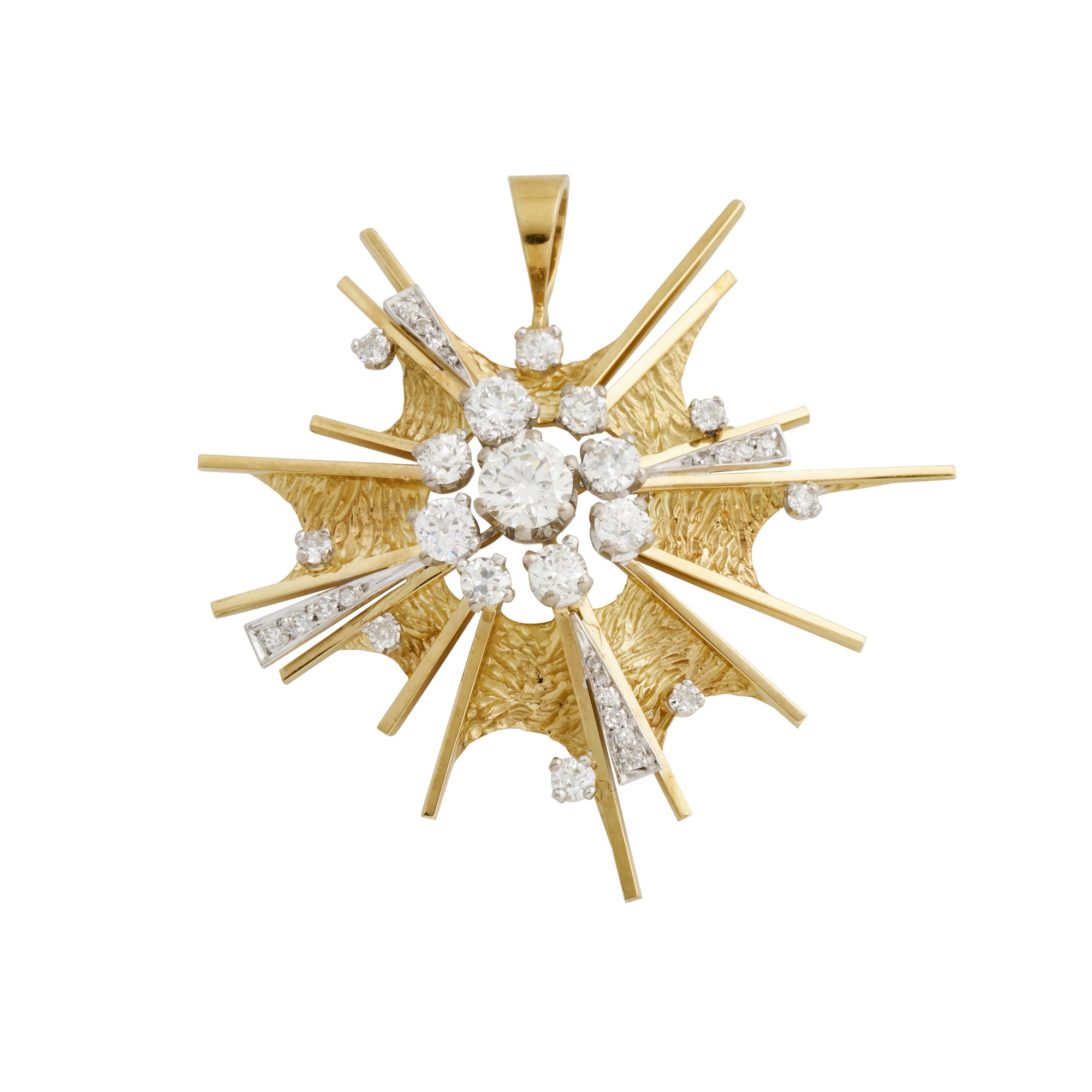 Centring a claw-set round brilliant-cut diamond weighing approximately .90 carats, surrounded by eight further claw-set round brilliant-cut diamonds with polished bars interspersed with claw-set round brilliant-cut diamonds and further set with in-filled pavé-set diamonds to a tapered bale, the diamonds together weighing approximately 2.50 carats, width approximately 55mm, gross weight approximately 14.1 grams.