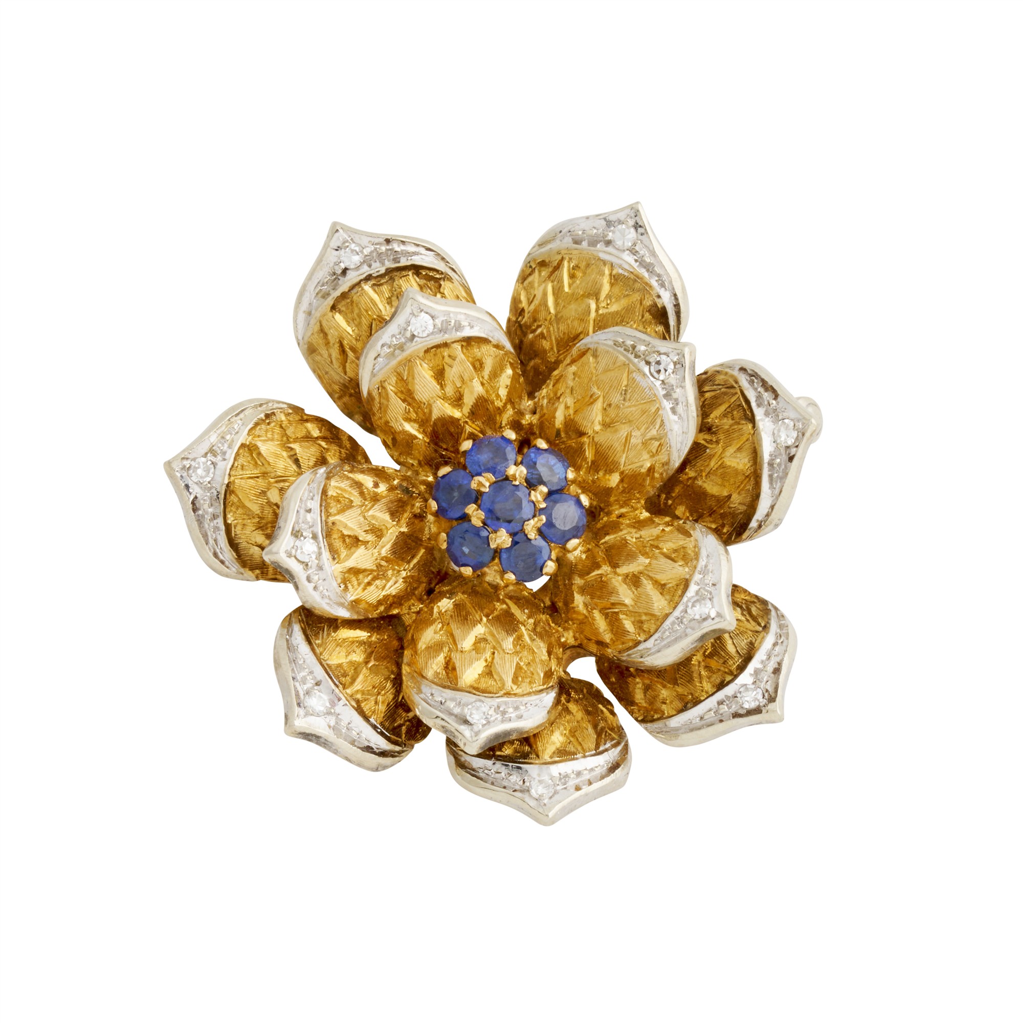 18CT TWO-TONE GOLD, SAPPHIRE AND DIAMOND BROOCH