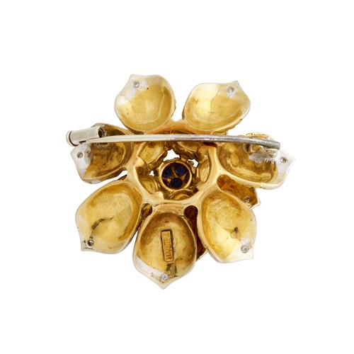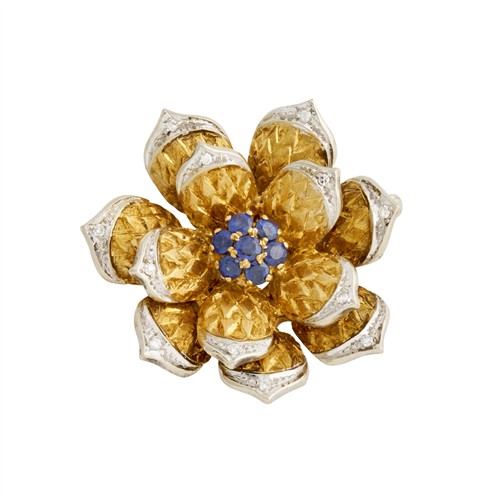 Of floral design centring a cluster of seven claw-set round blue sapphires with a double tiered layer of satin textured petals with white tips including a claw-set round brilliant-cut diamond in each, to a push clasp, width approximately 40mm, gross weight approximately 19.2 grams.
