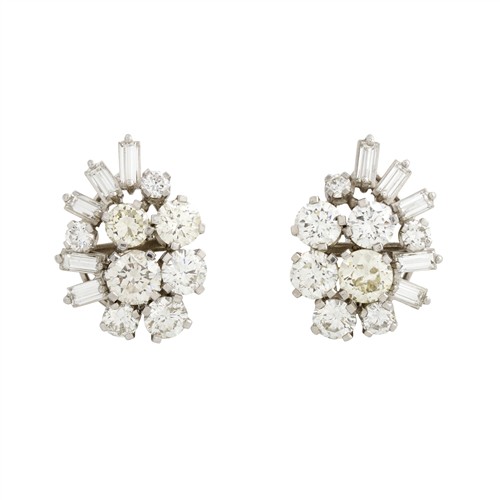 Each comprising seven claw-set round brilliant-cut diamonds flanked by five claw-set baguette-cut diamonds to a post and clip, the diamonds together weighing approximately 6.00 carats, length approximately 25mm, gross weight approximately 10.0 grams.