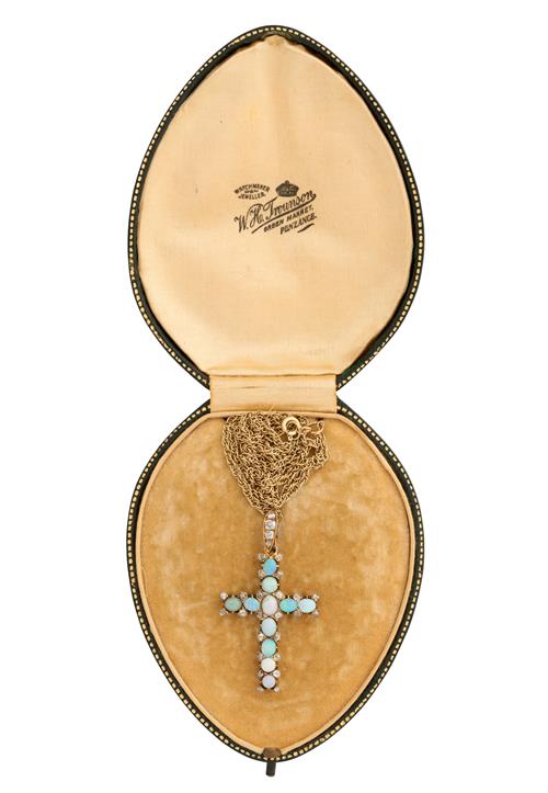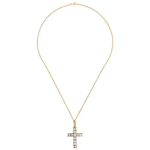 Modelled as a cross, set throughout with oval opals cut en-cabochon and old European-cut diamonds, suspended from a diamond set bale to a 9 carat gold cable link chain completed by a bolt ring clasp, pendant length 49mm, chain length 500mm, gross weight approximately 9.0 grams.