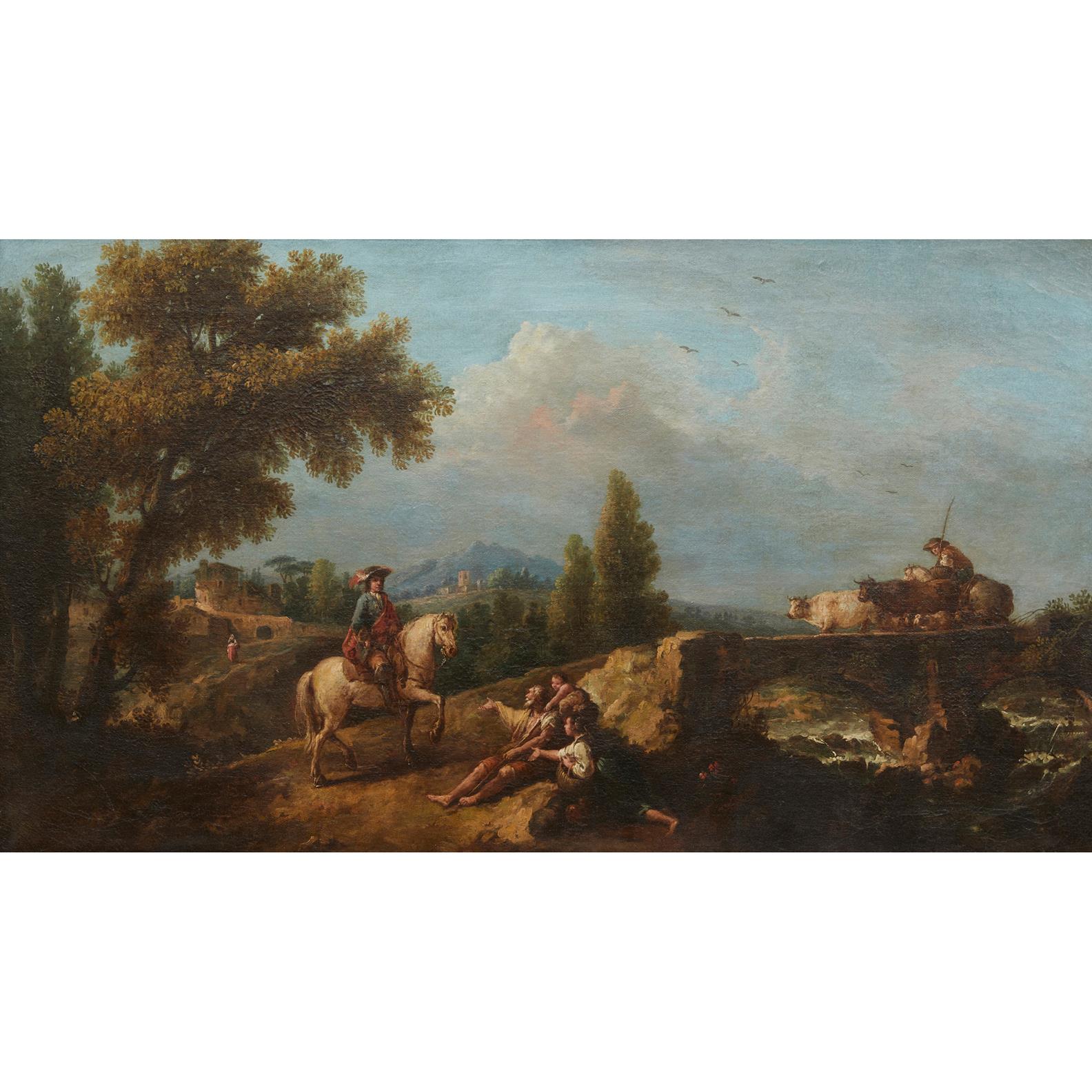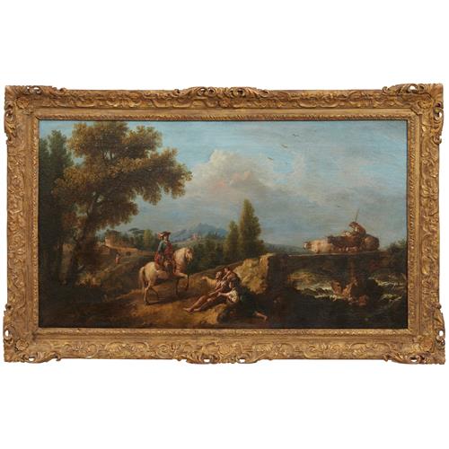 And it is precisely across the Channel that one must look to fully understand and appreciate this painting, which sets the stage for an Arcadian landscape capable of hosting reflections on the many artistic currents of the time. We refer to the French Rococo, embodied by the elegant cavalier with his charming hat, followed by the shepherd and livestock on the stone bridge-an evident homage to Nicolaes Berchem (Haarlem, 1620 - Amsterdam, 1683), interpreted through the Venetian stylistic lens.