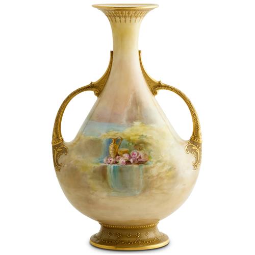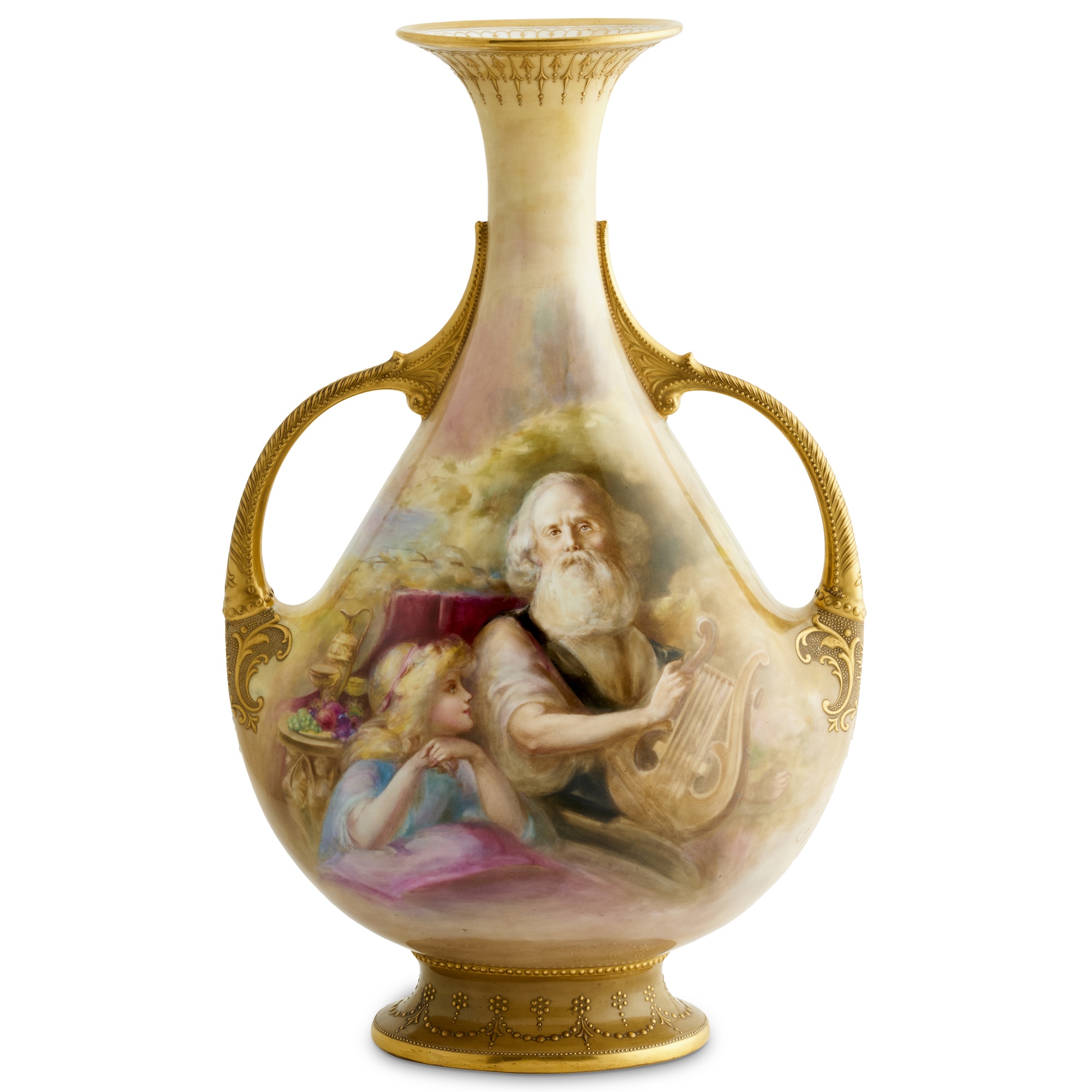 The flattened baluster-shaped body with a pair of loop handles to the shoulders raised on an oval foot, the front decorated with a scene of a young girl listening to a lyre-playing bard, signed, the reverse with a still-life of roses and objects, the mouth, handles, and foot gilt, the underside with painted title, printed green factory mark, and incised 1068 / 6-11