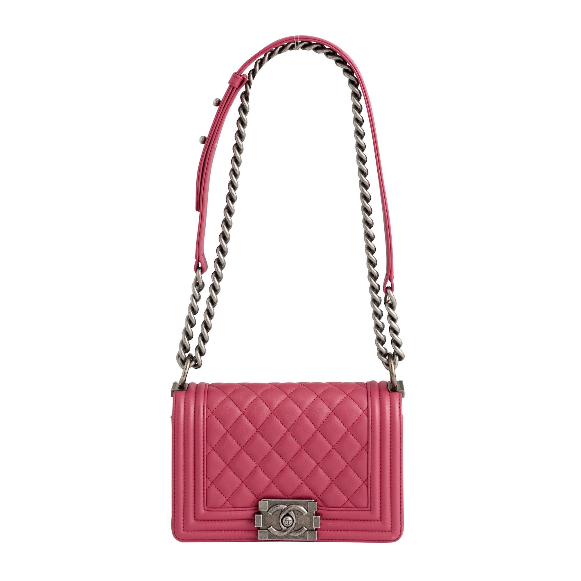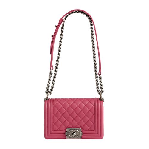 Styled in pink chevron quilted leather with coordinating trim and aged look silver tone hardware, featuring adjustable chain detail strap, measures 20 x 11 x 6 cm.
