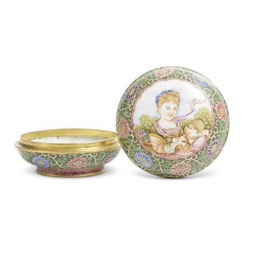A CHINESE PAINTED ENAMEL FANGLANGCAI ON GILT BRONZE COSMETIC BOX AND COVER, KANGXI FOUR-CHARACTER MARK, LATE 19TH CENTURY OR EARLIER