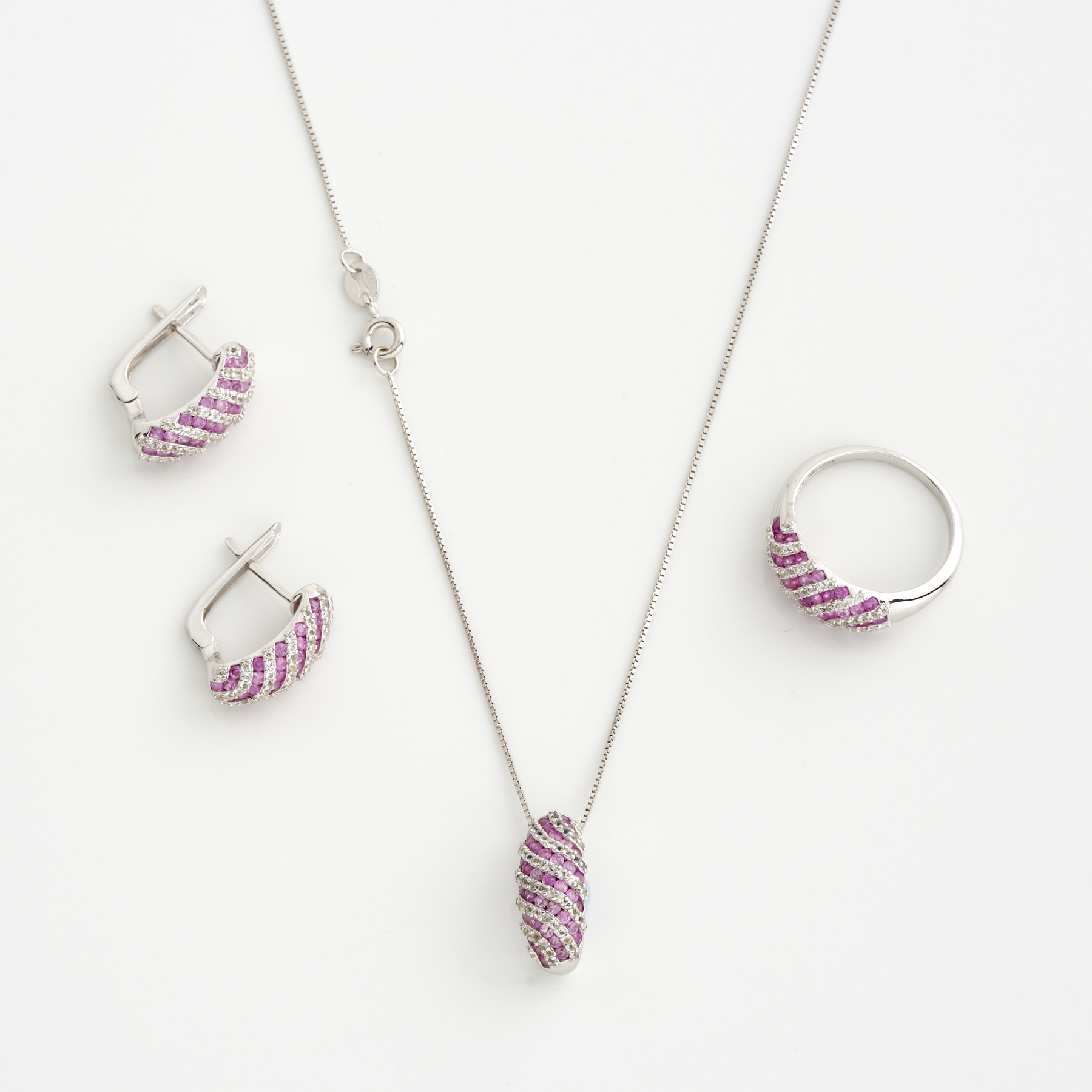 A PINK SAPPHIRE AND CUBIC ZIRCONIA SUITE IN STERLING SILVER, COMPRISING A RING, SIZE N 1/2, A NECKLACE MEASURING 480MM AND PAIR OF EARRINGS TO POST AND HINGE FITTINGS 20MM