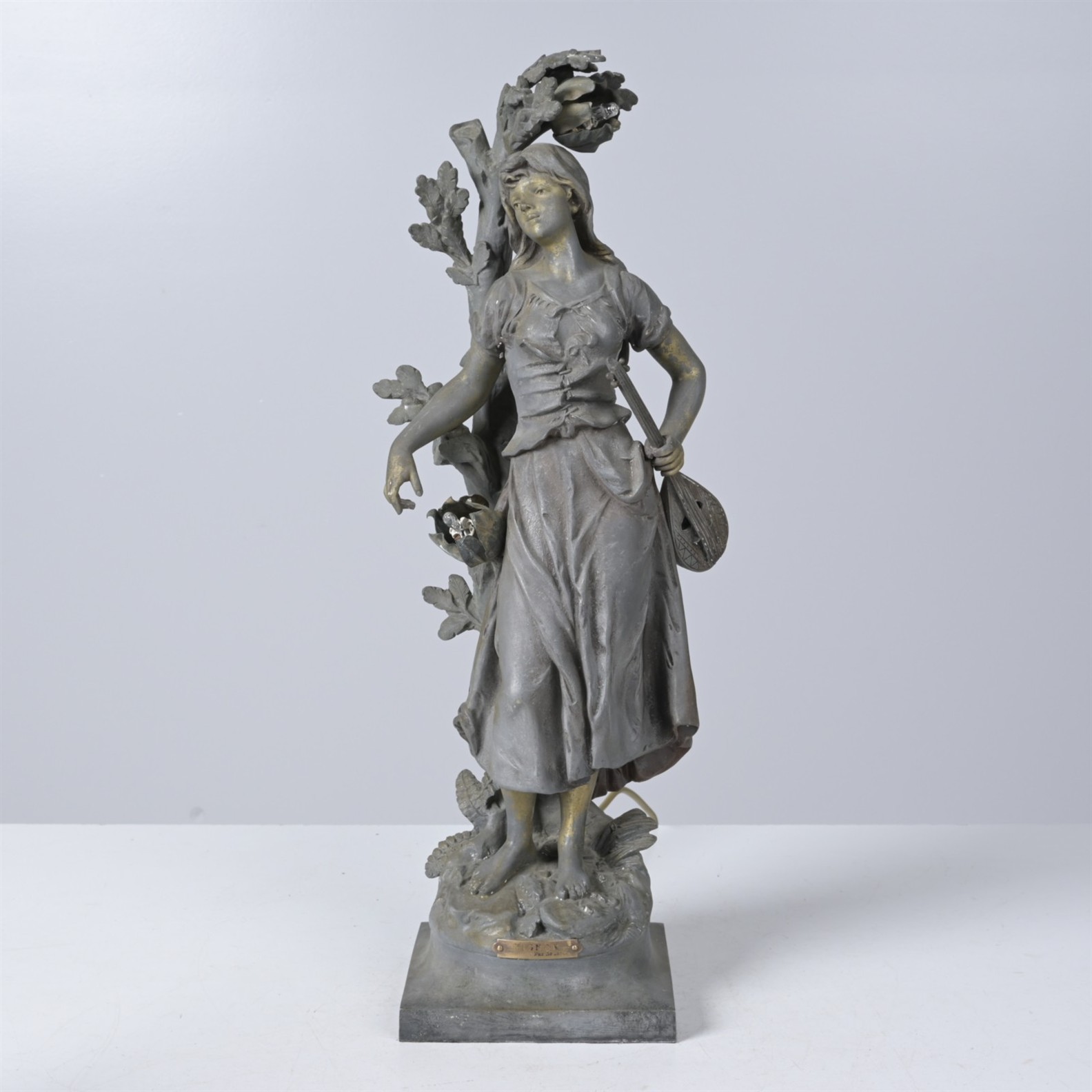 AN ANTIQUE FRENCH SPELTER FIGURAL TABLE LAMP (A/F) (60CM H X 17CM W X 17CM D)