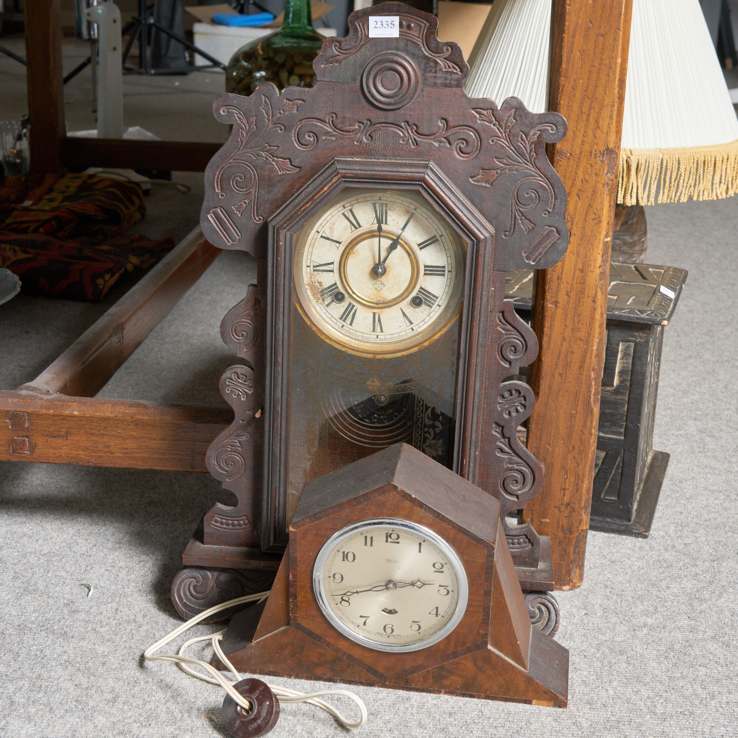 AN ART DECO MANTEL CLOCK AND AN ANSONIA COTTAGE CLOCK (WITH PENDULUM) (A/F) H.56CM (TALLEST)