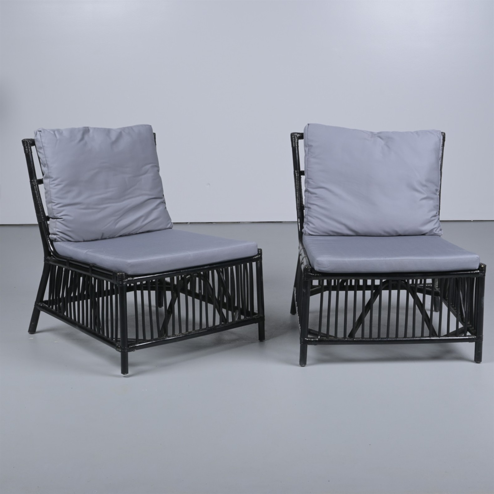 A PAIR OF BLACK RATTAN LOUNGE CHAIRS (85H X 70W X 80D CM)
