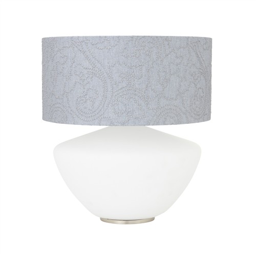 Satin finish white glass base with textile shade.