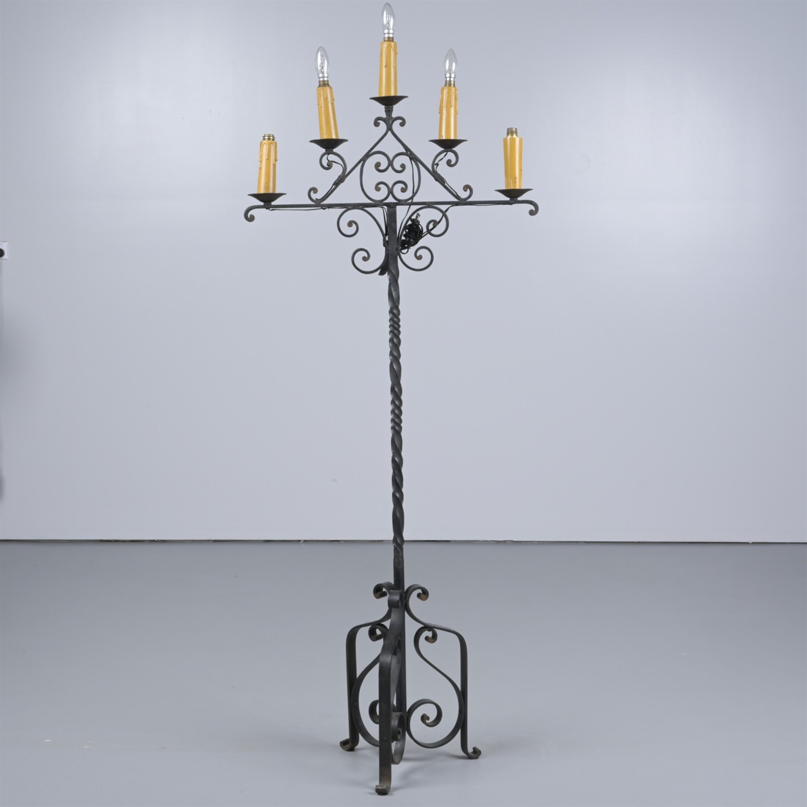 A WROUGHT IRON CANDELABRA CONVERTED TO ELECTRICITY (190H X 72W CM)