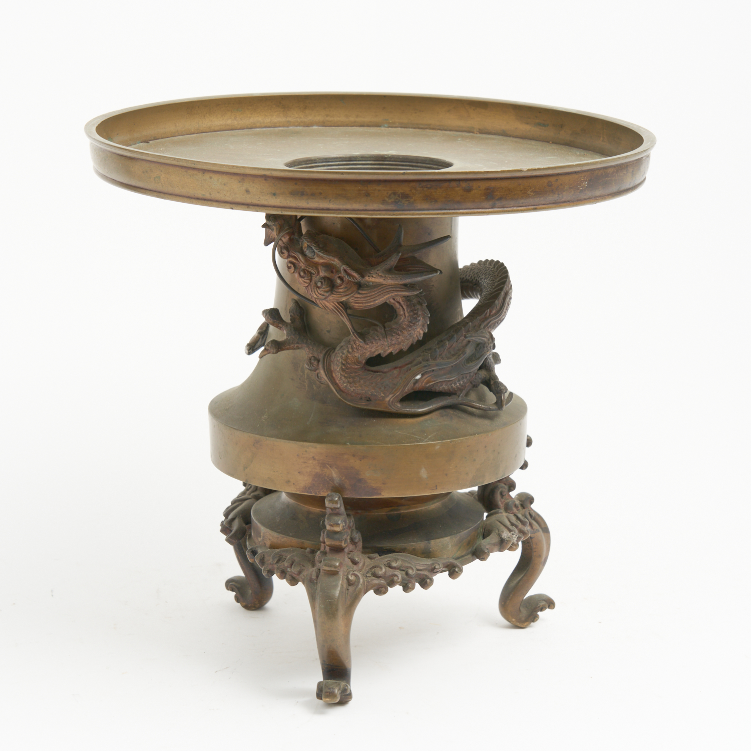 A JAPANESE BRONZE FLOWER VASE ADORNED WITH A NICELY CAST DRAGON, RAISED ON THREE WAVE-FORM FEET (SLIGHTLY BENT) H.28.5CM