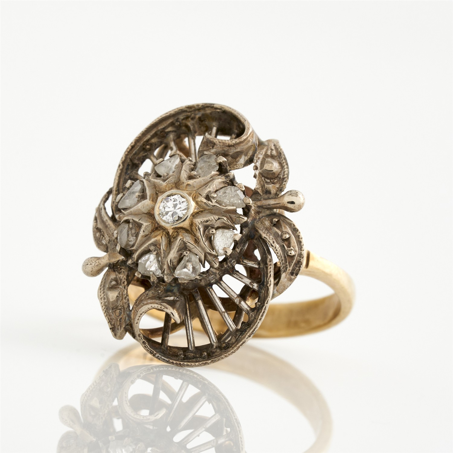 AN CLUSTER DIAMOND AND FILIGREE BASKET RING IN 9CT AND LOW CARAT GOLD, SIZE O, 4.6GMS