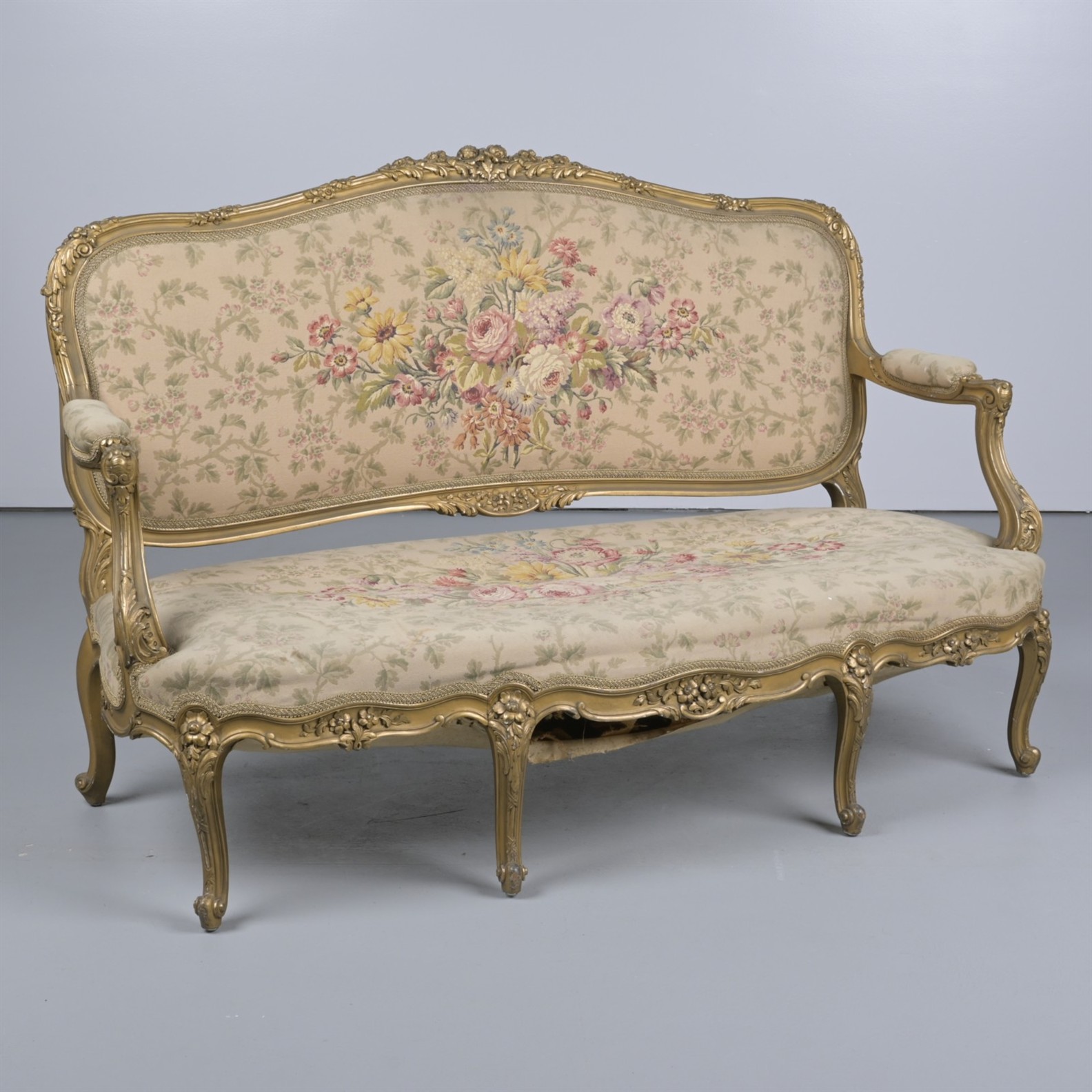A LOUIS XV-STYLE GILTWOOD AND UPHOLSTERED SOFA (109H X 167W X 80D CM) (THIS ITEM MUST BE REMOVED BY PROFESSIONAL CARRIERS OR CLIENTS. LEONARD JOEL STAFF CANNOT ASSIST WITH CARRYING OR DELIVERY OF THIS ITEM)