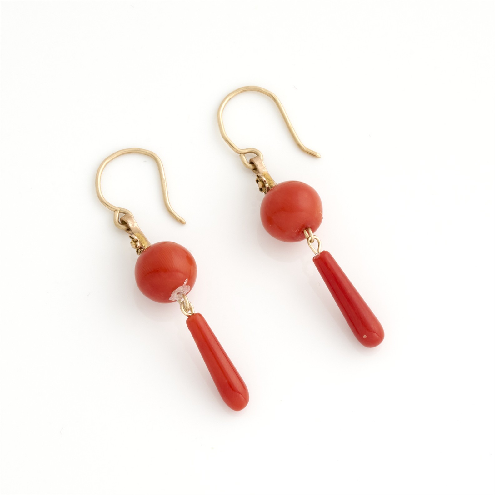 A PAIR OF CORAL EARRINGS IN 9CT GOLD, TO SHEPHERD HOOK FITTINGS, 50MM