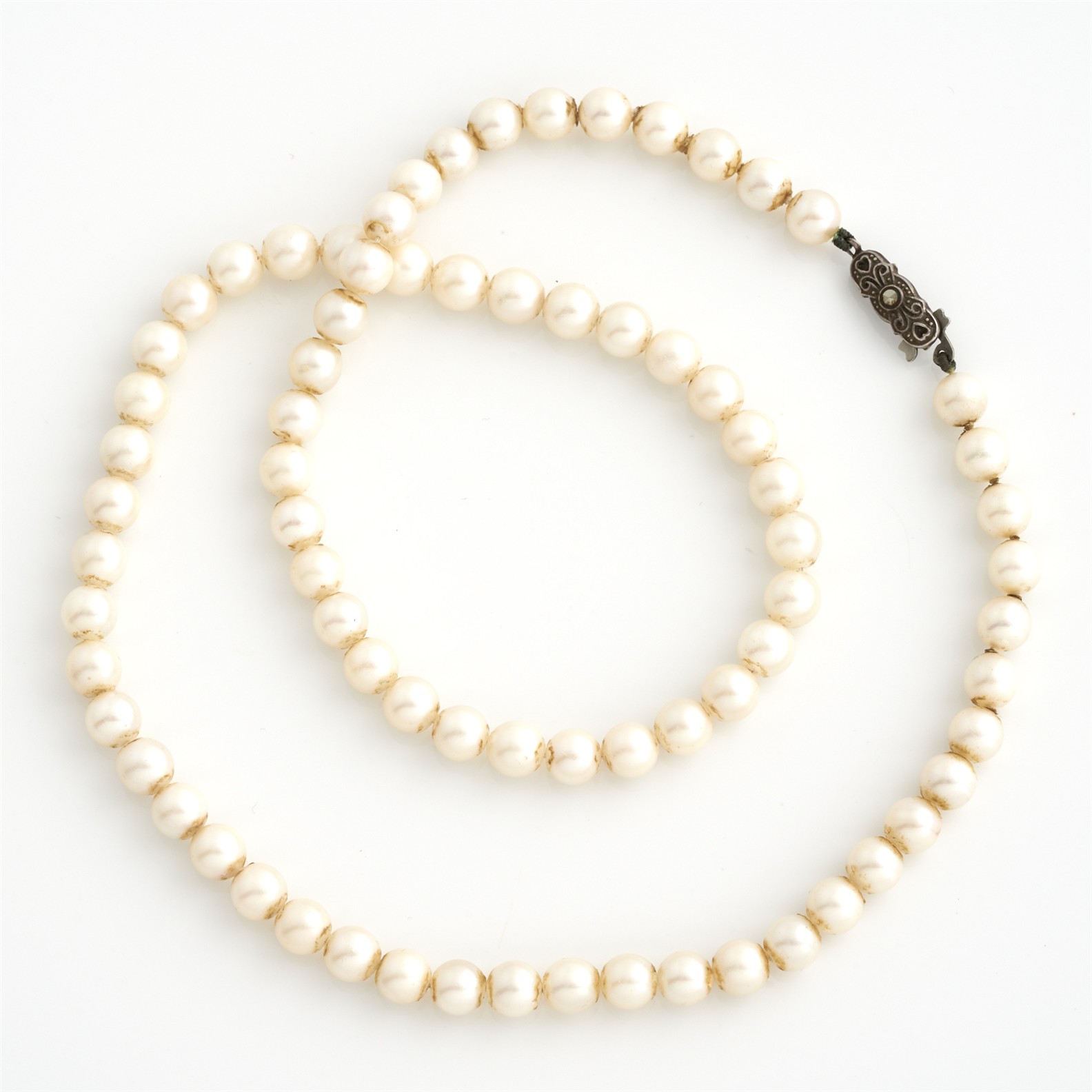 A PEARL STRAND TO A CLASP IN STERLING SILVER, 500MM