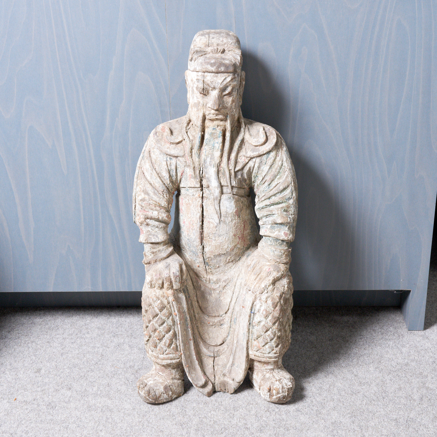 A CHINESE ANTIQUE CARVED FIGURE OF A SEATED MONK, WITH REMNANT POLYCHROME (A/F) H.69CM