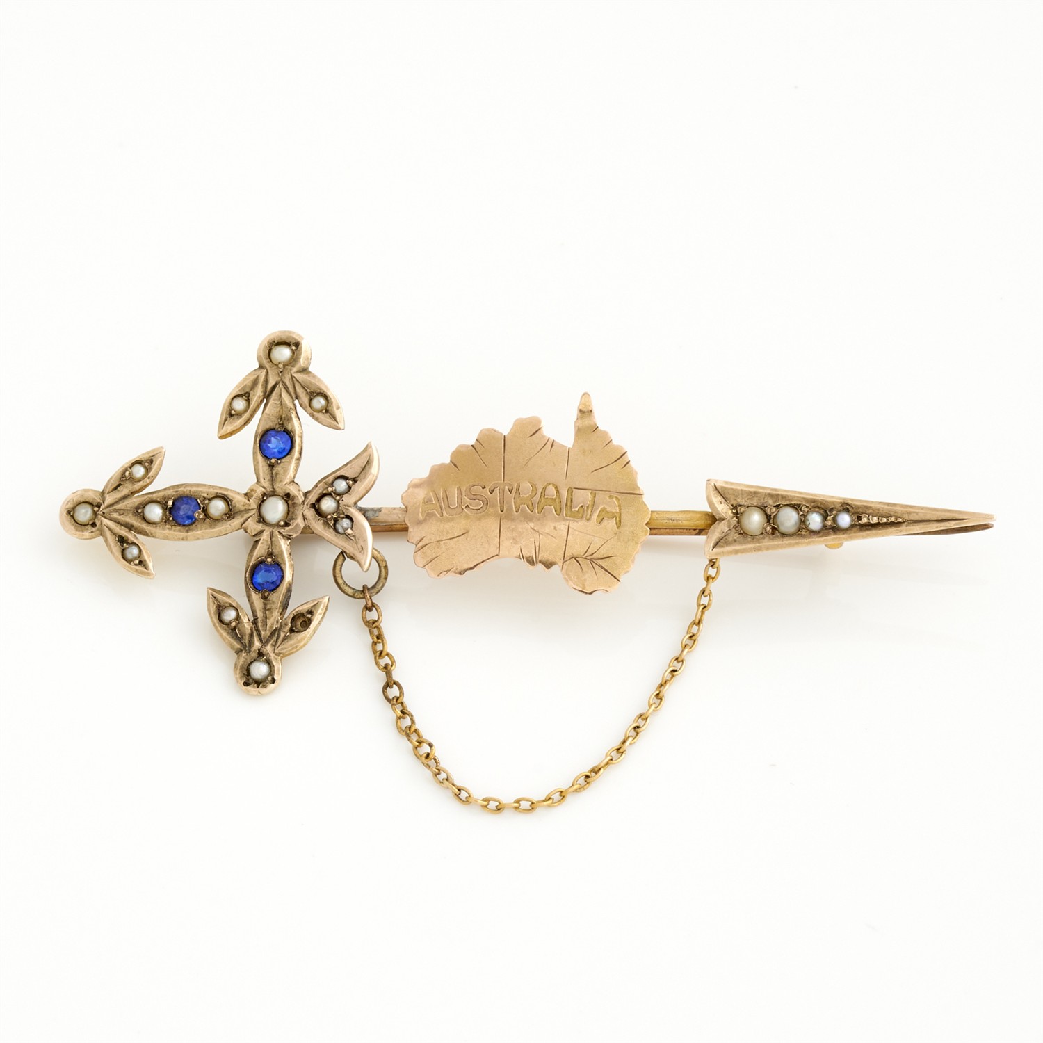 A VINTAGE AUSTRALIANA SAPPHIRE AND SEED PEARL BROOCH IN 9CT GOLD, 70MM X 30MM, 4.7GMS