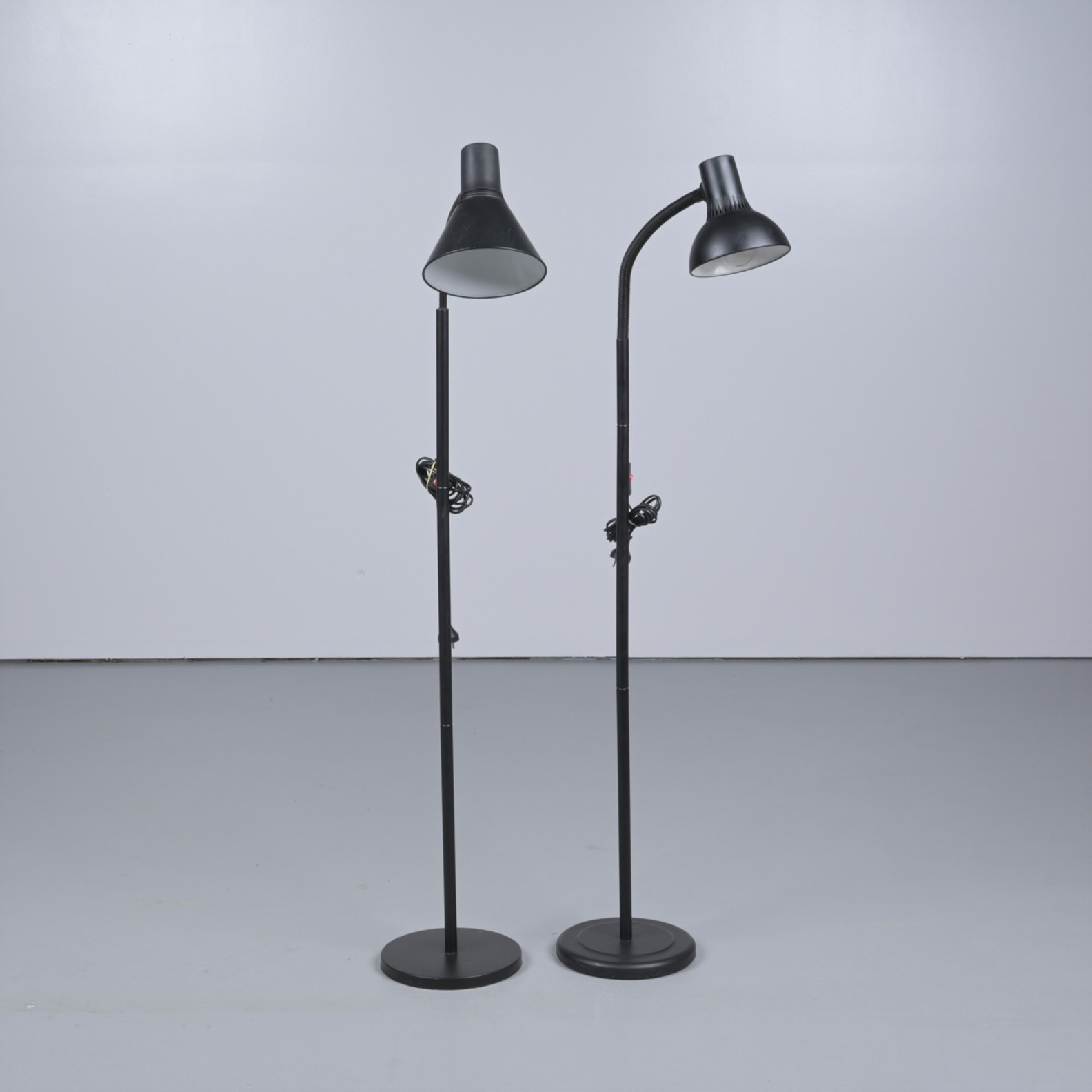 TWO BLACK GOOSENECK STANDARD LAMPS (145CM H, TALLEST)