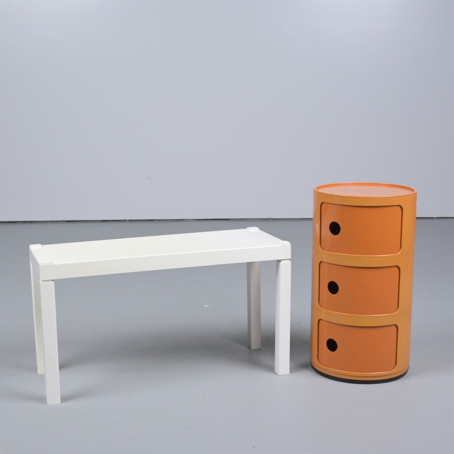 A KARTELL- STYLE STORAGE UNIT TOGETHER WITH A SIDE TABLE (59H X 32DIA CM, TALLEST)