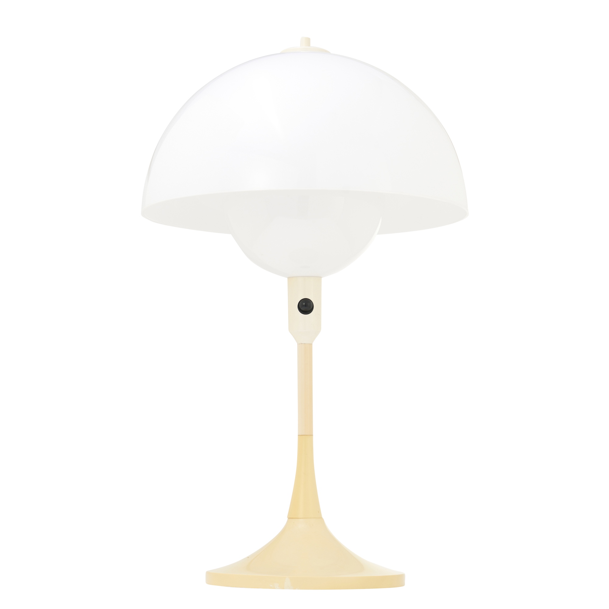 Rounded white plastic shade and diffuser on off-white base.