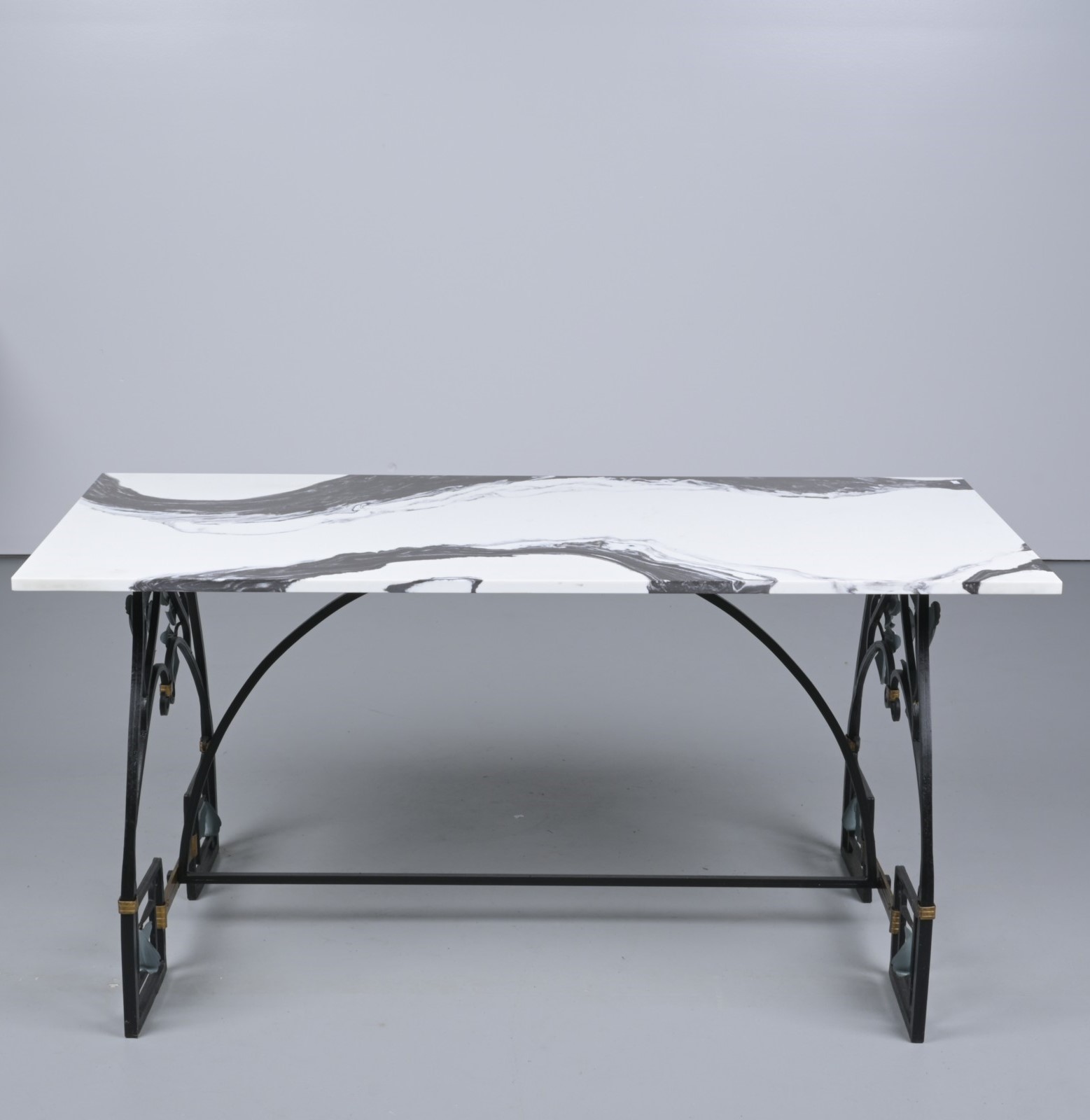 A WROUGHT METAL TABLE IN EARLY 20th CENTURY CONTINENTAL MANNER WITH RECONSTITUTED STONE TOP (74H X 155W X 70D CM) (THIS ITEM MUST BE REMOVED BY PROFESSIONAL CARRIERS OR CLIENTS. LEONARD JOEL STAFF CANNOT ASSIST WITH CARRYING OR DELIVERY OF THIS ITEM)
