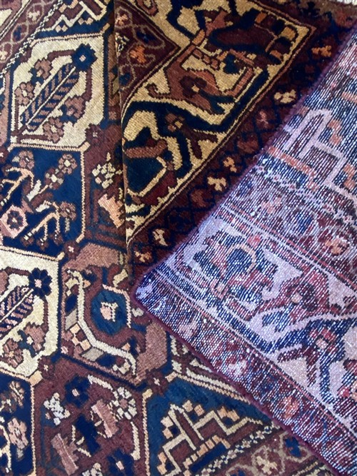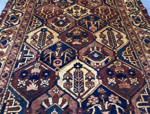 WOOL PILE & VEGETABLE DYES. HAND-KNOTTED WEAVE FROM THE SOUTHERN CHAHARMAHAL & BAKHTIARI PROVINCE WITH NOMADIC PICTORIAL GARDEN DESIGN WITH PANELS CONTAINING GARDEN THEMES OF CYPRESS TREES, FLORAL SHRUBS, AUTUMN TREES, PEACOCKS & URNS BEARING FLORAL FOLIAGE. BORDER OF PALMETTES. ALL-OVER COLOUR TONES OF MADDER, INDIGO, TERRACOTTA & CREAM.