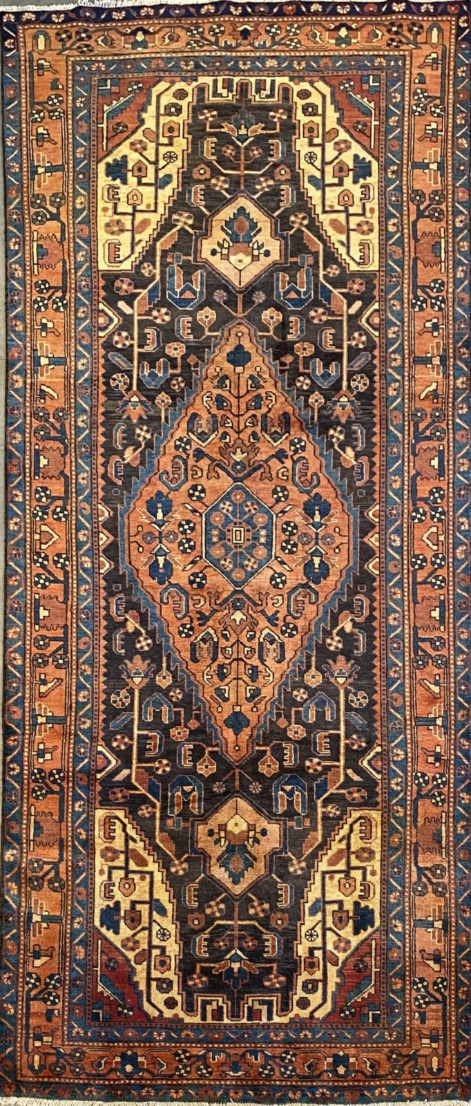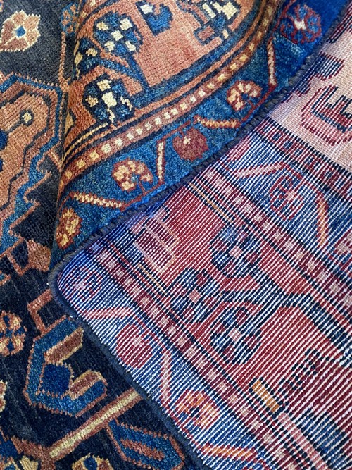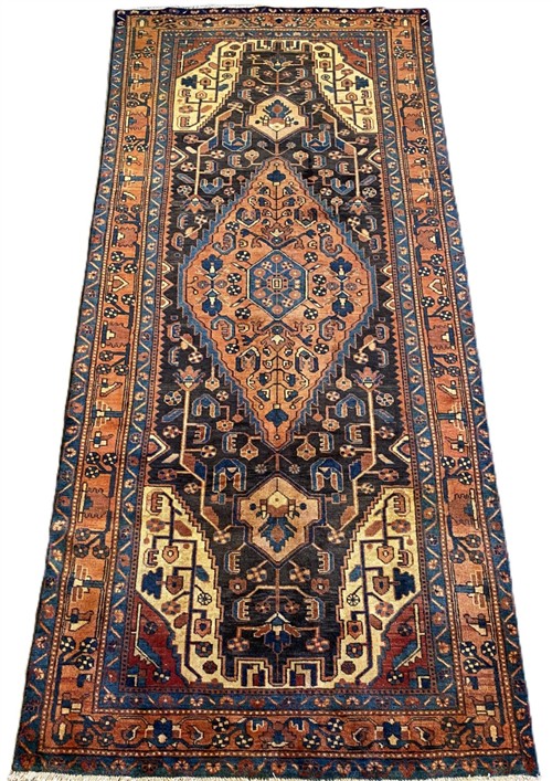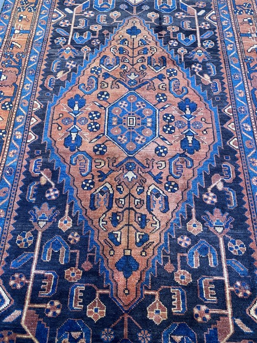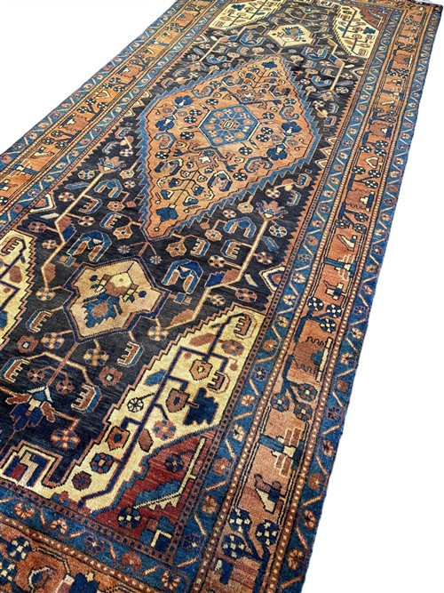 VEGETABLE DYES WITH NATURAL ABRASH COLOUR VARIATION. HAND-KNOTTED VILLAGE WEAVE FROM THE HAMADAN REGION WITH A DISTINCT DESIGN OF CENTRAL BOLD ANCHORED MEDALLION CONTAINING FLORAL PATTERNS & CORNER MEDALLIONS IN AN INDIGO FIELD OF FLORAL PATTERNS. BORDER OF PALMETTES & FLOWER HEADS.