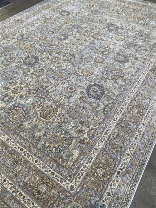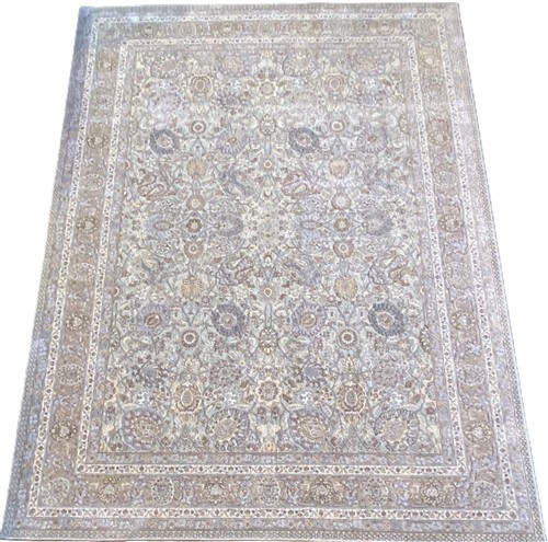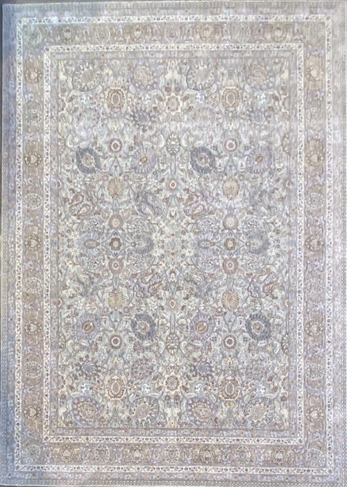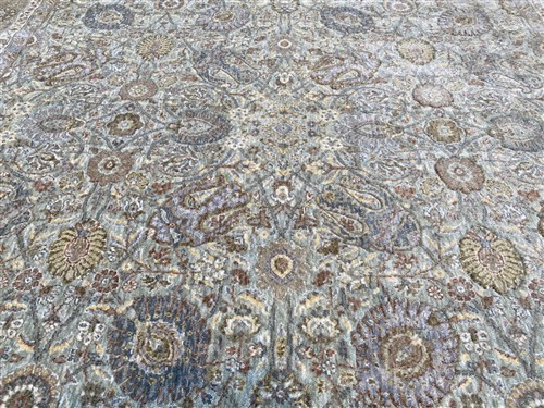 GALLERY EXHIBITED. WOOL PILE. POWER-LOOM WEAVE WITH EMBOSSED PATTERNS. RECREATION OF AN ANTIQUE MOGUL CARPET WITH ALL-OVER BOLD PALMETTES SET AGAINST INTRICATE FLORAL PATTERNS. THE ENTIRE IN SUBTLE TONES OF CARAMEL, SOFT BLUE, CHOCOLATE, SAGE & IVORY.