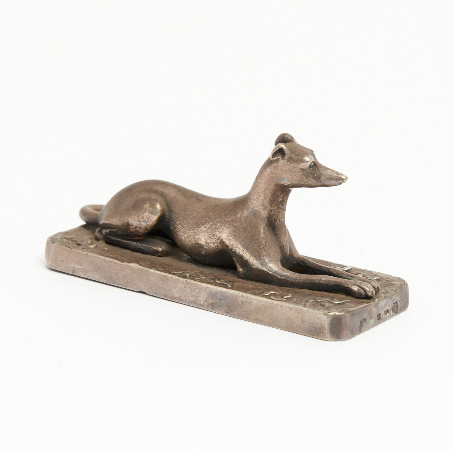 AN ELKINGTON SILVER PLATE RECUMBENT GREYHOUND L.9.5CM