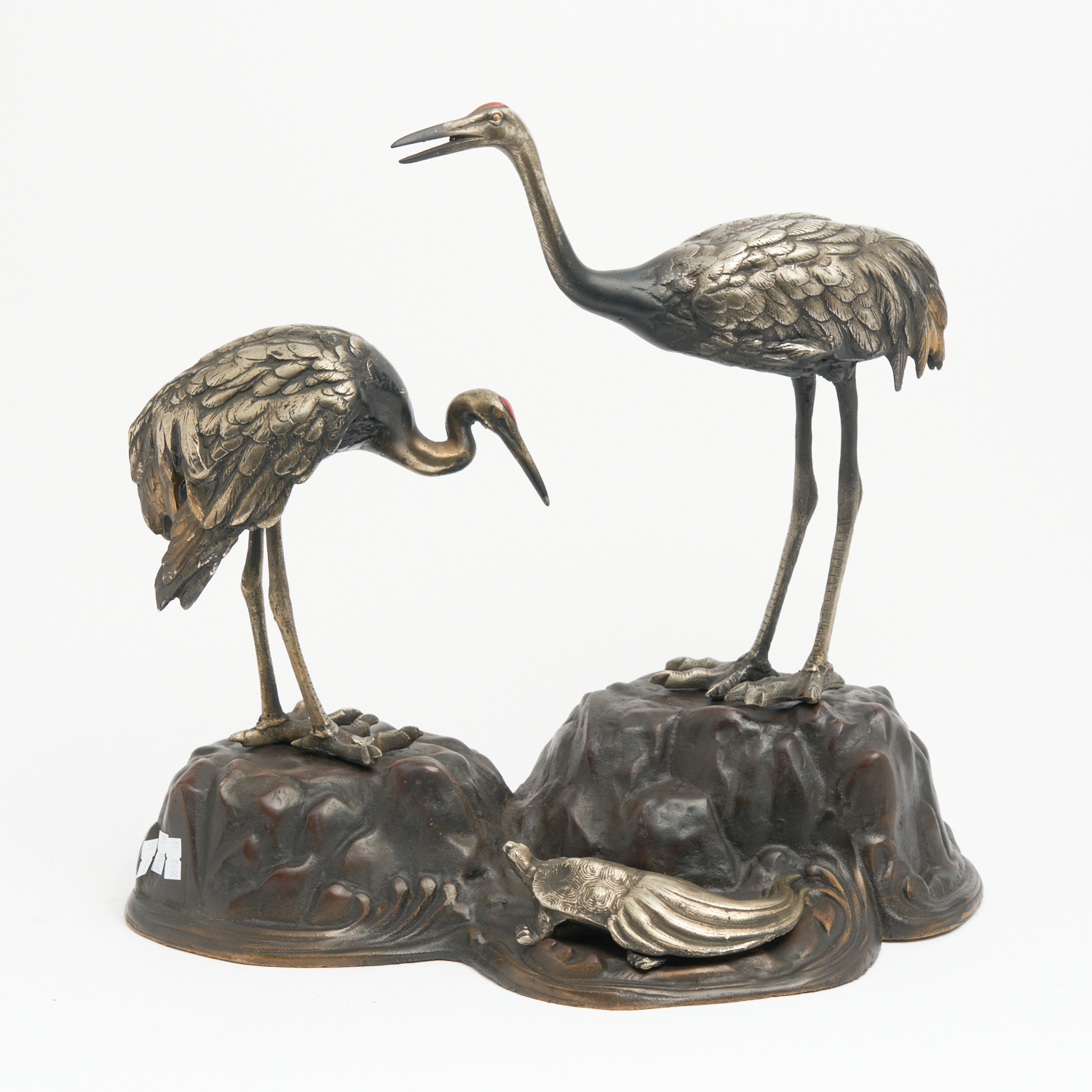 A JAPANESE CAST METAL FIGURE OF TWO CRANES AND A TAILED TORTOISE ATOP A ROCKY OUT CROP H.45CM