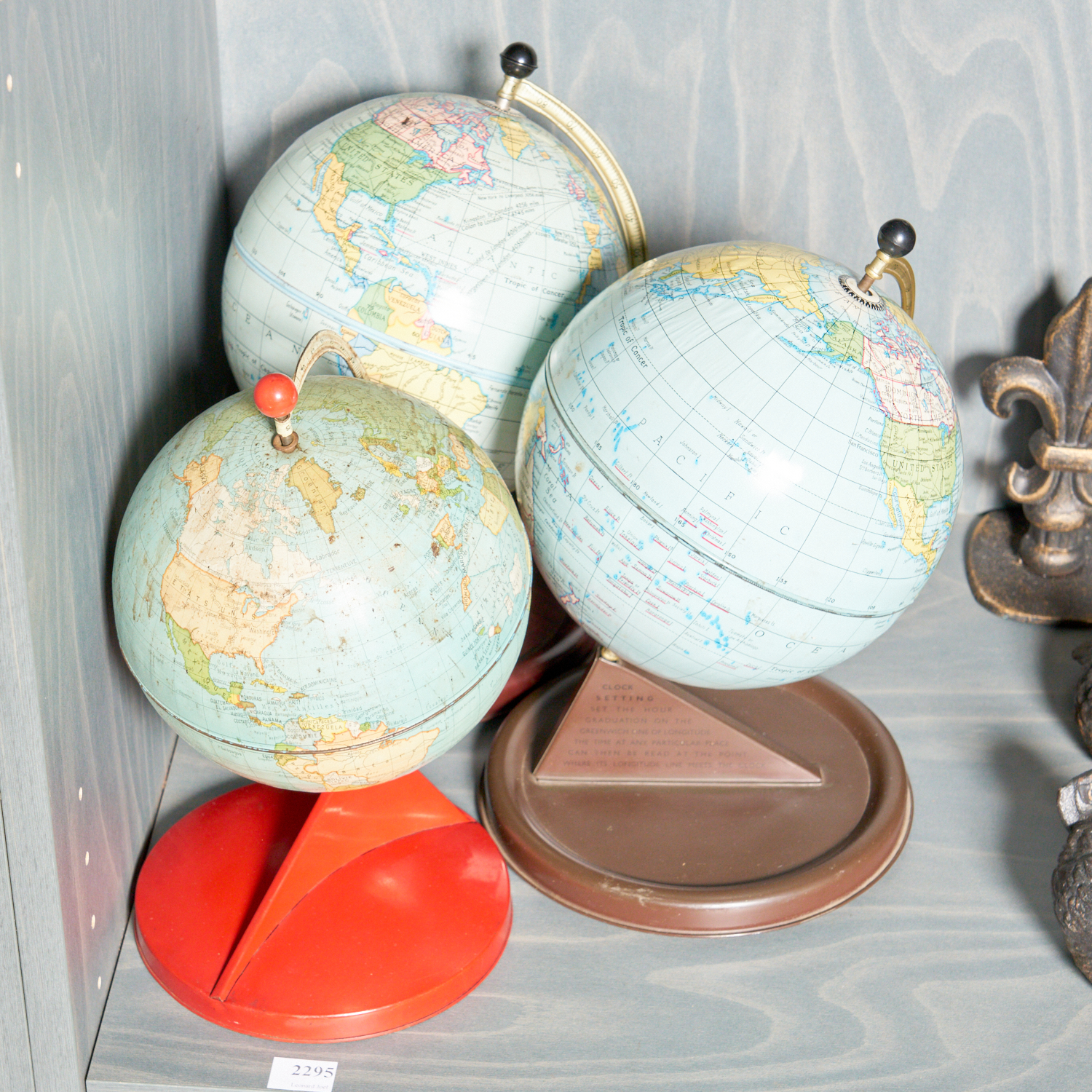 THREE MID-CENTURY ENGLISH TIN WORLD GLOBES BY CHAD VALLEY (A/F) H.27CM (LARGEST)